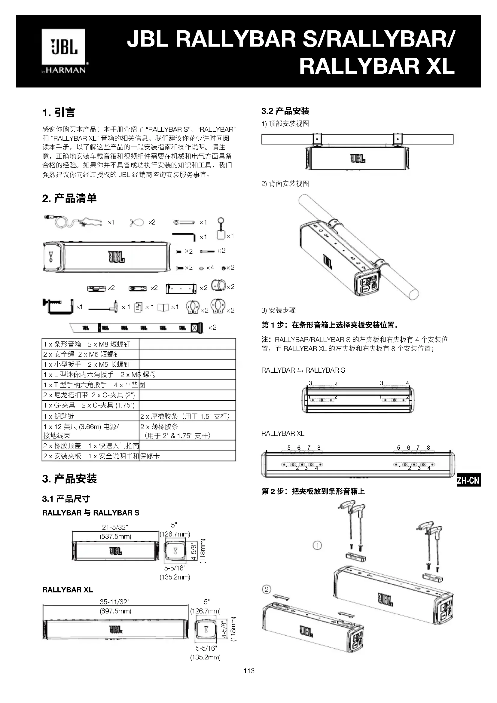 感谢你购买本产品!本手册介绍了 “RALLYBAR S”、“RALLYBAR” 和 “RALLYBAR XL” 音箱的相关信息。我们建议你花少许时间阅读本手册,以了解这些产品的一般安装指南和操作说明。请注意,正确地安装车载音箱和视频组件需要在机械和电气方面具备合格的经验。如果你并不具备成功执行安装的知识和工具,我们强烈建议你向经过授权的 JBL 经销商咨询安装服务事宜。