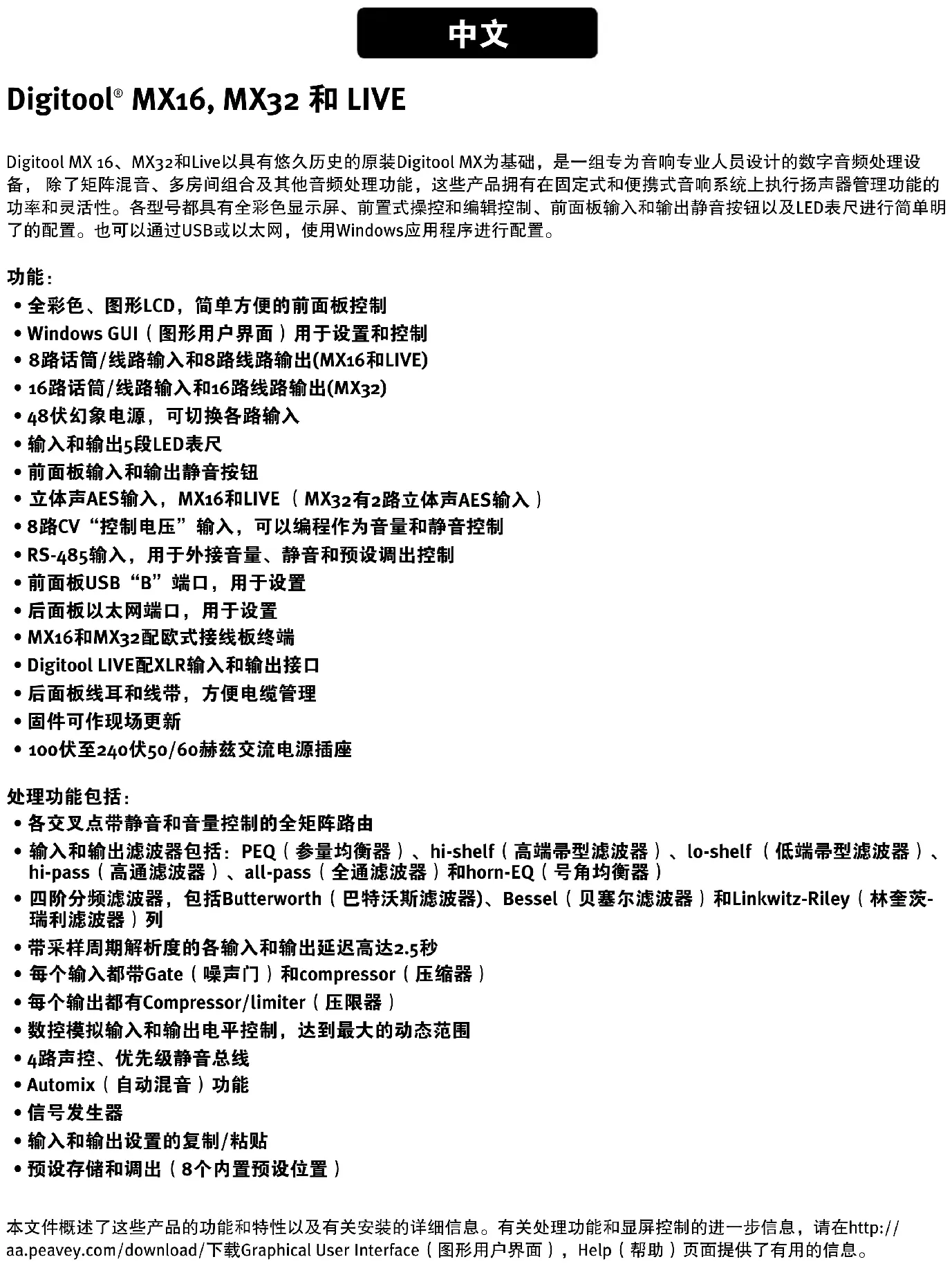 - 预设存储和调出(8个内置预设位置) 本文件概述了这些产品的功能和特性以及有关安装的详细信息。有关处理功能和显屏控制的进一步信息,请在http:// aa.peavey.com/download/下载Graphical User Interface(图形用户界面),Help(帮助)页面提供了有用的信息。Digitool