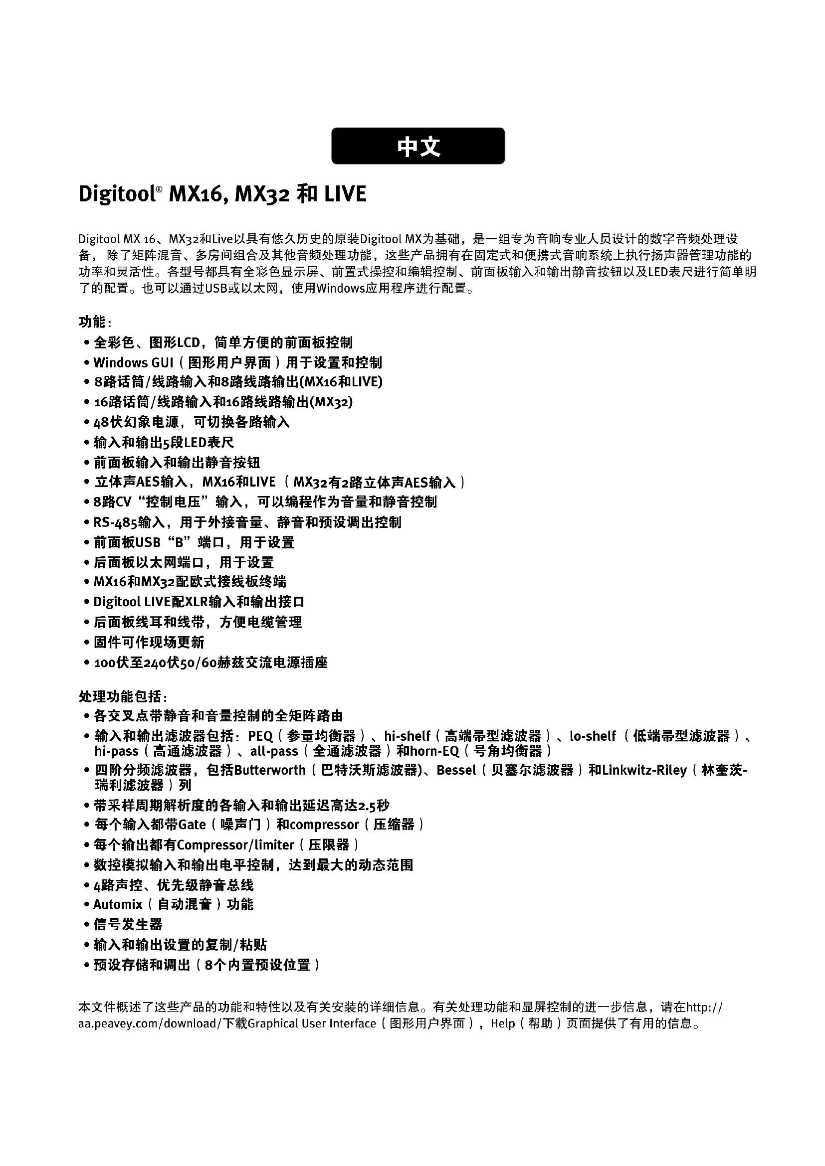 - 预设存储和调出(8个内置预设位置) 本文件概述了这些产品的功能和特性以及有关安装的详细信息。有关处理功能和显屏控制的进一步信息,请在http:// aa.peavey.com/download/下载Graphical User Interface(图形用户界面),Help(帮助)页面提供了有用的信息。Digitool