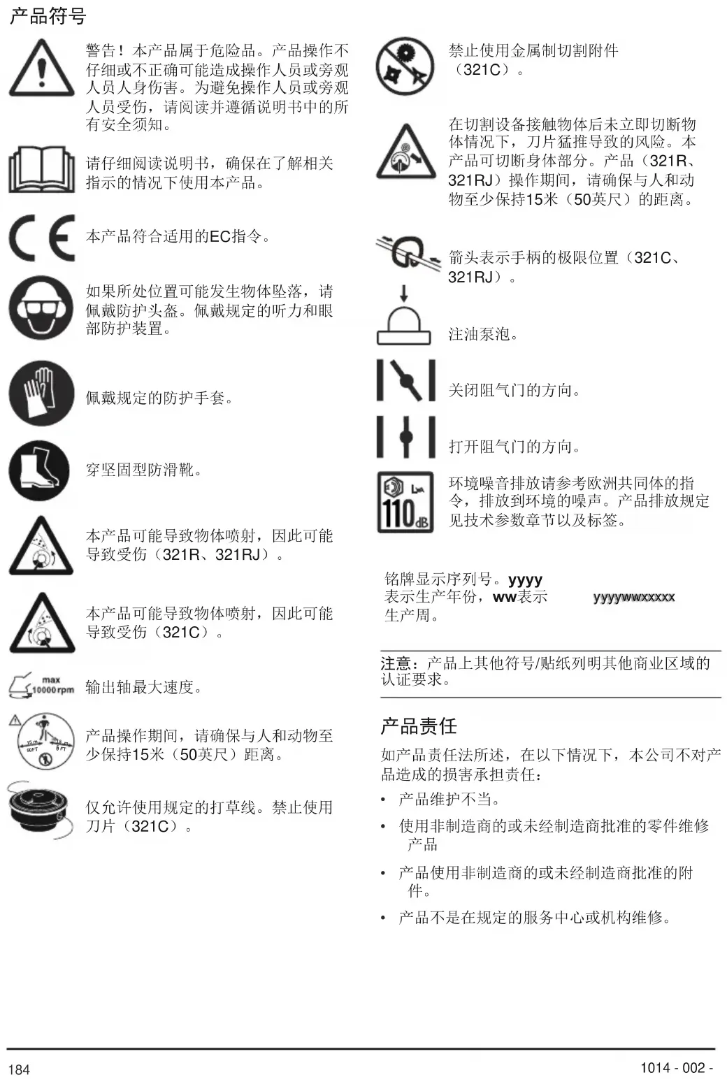 yyywwxxxxx 禁止使用金属制切割附件 (321C)。 箭头表示手柄的极限位置(321C、 321RJ)。 注意:产品上其他符号/贴纸列明其他商业区域的