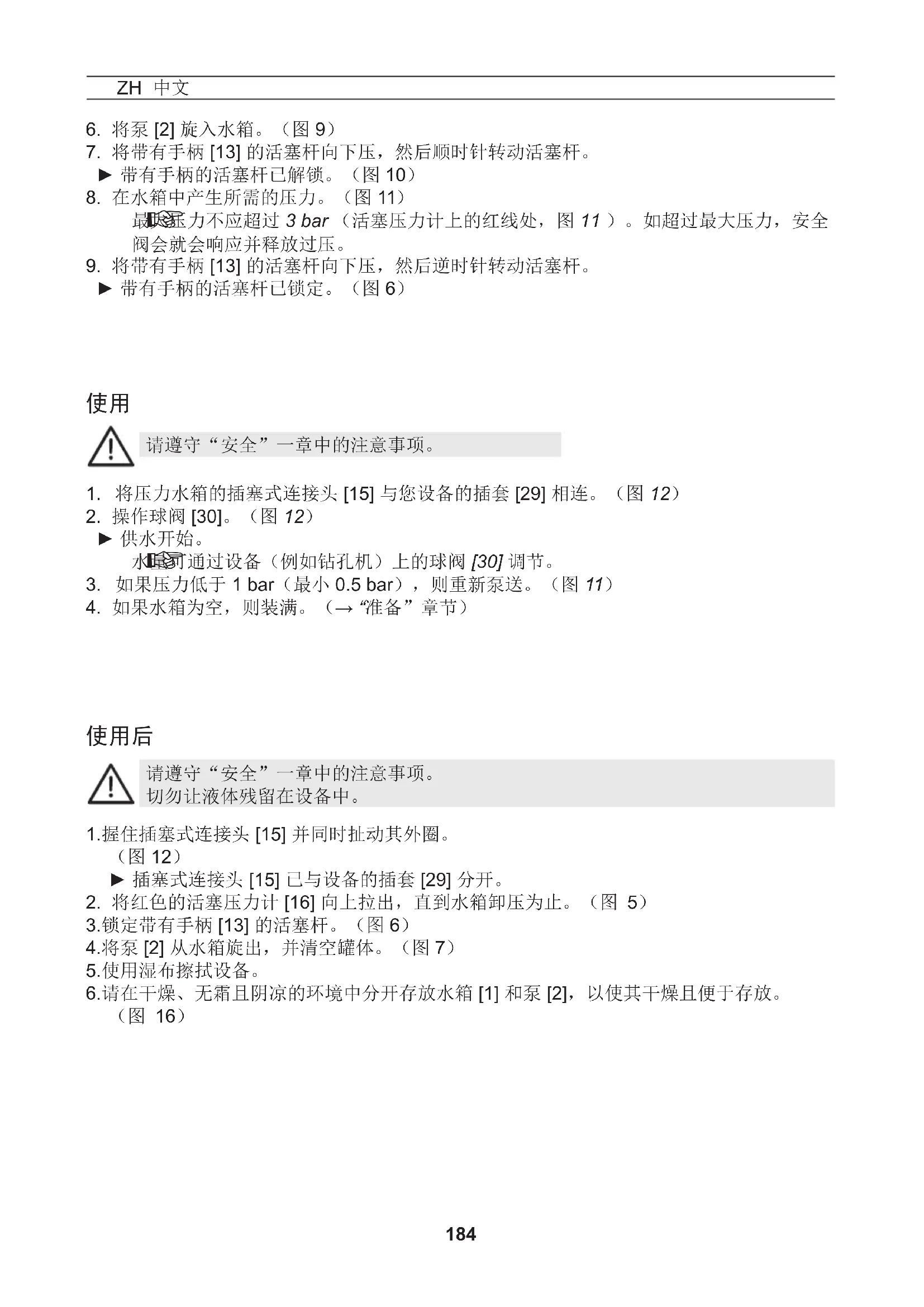 3.锁定带有手柄 [13] 的活塞杆。(图 6) 4.将泵 [2] 从水箱旋出,并清空罐体。(图 7) ZH 中文