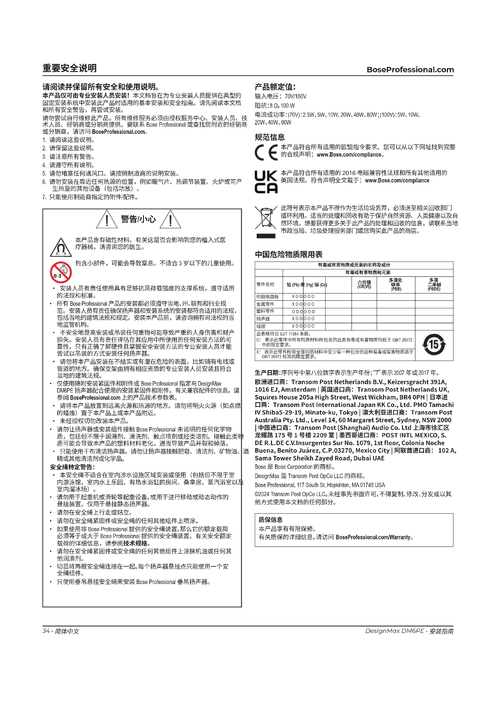 有毒或有害物质或元素的名称及成分有毒或有害物质和元素 铅 (Pb) 汞 (Hg) 镉 (Cd)六价铬 (CR(VI))多溴化 联苯 (PBB)多溴 二苯醚 (PBDE)印刷电路板X O O O O O X O O O O O O O O O O O X O O O O O X O O O O O此表格符合 SJ/T 11364 条款。O: 表示此零件中所有均质材料所包含的此类有毒或有害物质均低于 GB/T 26572 中的限定要求。X: 表示此零件所用全部均质材料中至少有一种包含的这种有毒或有害物质高于 GB/T 26572 标准的限定要求。 生产日期:序列号中第八位数字表示生产年份;“7”表 示 2007 年或 2017 年。 欧洲进口商:Transom Post Netherlands B.V., Keizersgracht 391A, 1016 EJ, Amsterdam | 英国进口商:Transom Post Netherlands UK, Squires House 205a High Street, West Wickham, BR4 0PH | 日本进 口商:Transom Post International Japan KK Co., Ltd. PMO Tamachi IV Shiba5-29-19, Minato-ku, Tokyo | 澳大利亚进口商:Transom Post Australia Pty. Ltd., Level 14, 60 Margaret Street, Sydney, NSW 2000 | 中国进口商:Transom Post (Shanghai) Audio Co. Ltd 上海市徐汇区 龙耀路 175 号 1 号楼 2209 室 | 墨西哥进口商:POST INTL MEXICO, S. DE R.L.DE C.V.Insurgentes Sur No. 1079, 1st oor, Colonia Noche Buena, Benito Juárez, C.P.03270, Mexico City | 阿联酋进口商: 102 A, Sama Tower Sheikh Zayed Road, Dubai UAE Bose 是 Bose Corporation 的商标。 DesignMax 是 Transom Post OpCo LLC 的商标。 Bose Professional, 117 South St, Hopkinton, MA 01748 USA ©2024 Transom Post OpCo LLC。未经事先书面许可,不得复制、修改、分发或以其 他方式使用本文档的任何部分。