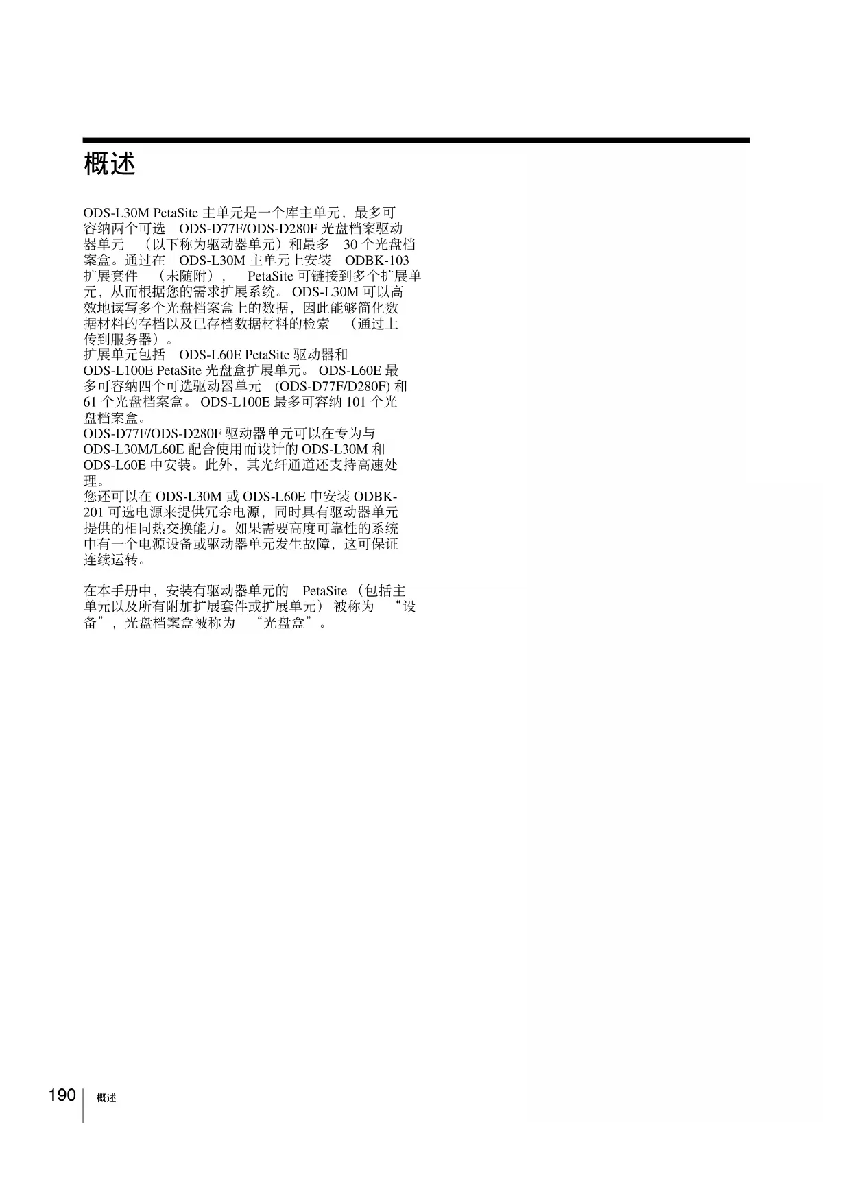 在本手册中,安装有驱动器单元的 PetaSite (包括主 单元以及所有附加扩展套件或扩展单元) 被称为 “设 备”,光盘档案盒被称为 “光盘盒”。191