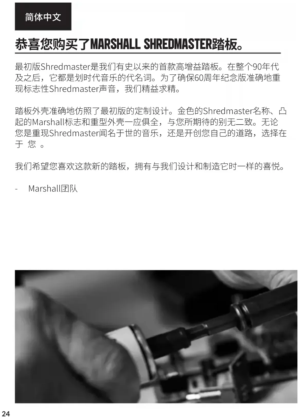 恭喜您购买了MARSHALL SHREDMASTER踏板。 最初版Shredmaster是我们有史以来的首款高增益踏板。在整个90年代 及之后,它都是划时代音乐的代名词。为了确保60周年纪念版准确地重 现标志性Shredmaster声音,我们精益求精。 踏板外壳准确地仿照了最初版的定制设计。金色的Shredmaster名称、凸 起的Marshall标志和重型外壳一应俱全,与您所期待的别无二致。无论 您是重现Shredmaster闻名于世的音乐,还是开创您自己的道路,选择在