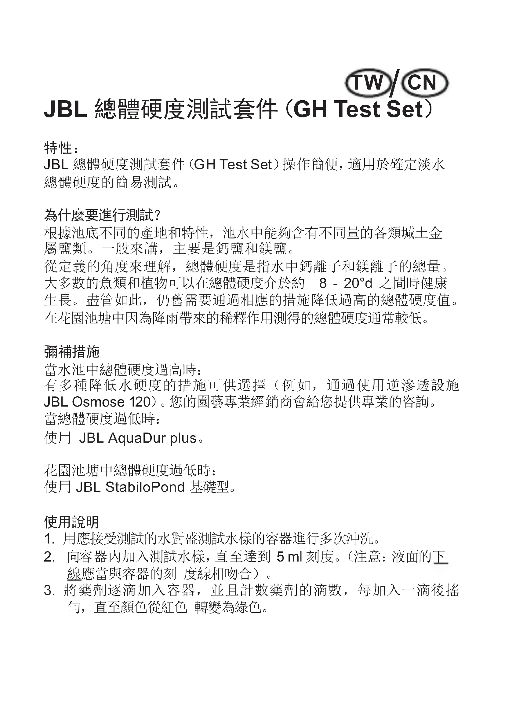 /4. 每滴藥劑相當於 1° 德國水總體硬度單位。 為了提升 顯 示 精 度 利用接受測試的水將測量容器填充至10 ml 刻度: 每用一滴藥劑溶液相當於 0.5° 德國水總體硬度。 說明:使用 10 ml 水樣時開始的幾滴顏色變化較弱。為了便於讀取 結果請將測量容器置於白色墊板之上。 將測試結果換算為其他常用的測量單位時請參照下表: 我們對於有環保意識的使用者的建議: JBL 測試套件的全部藥劑均以價格便宜的填充裝形式有售!