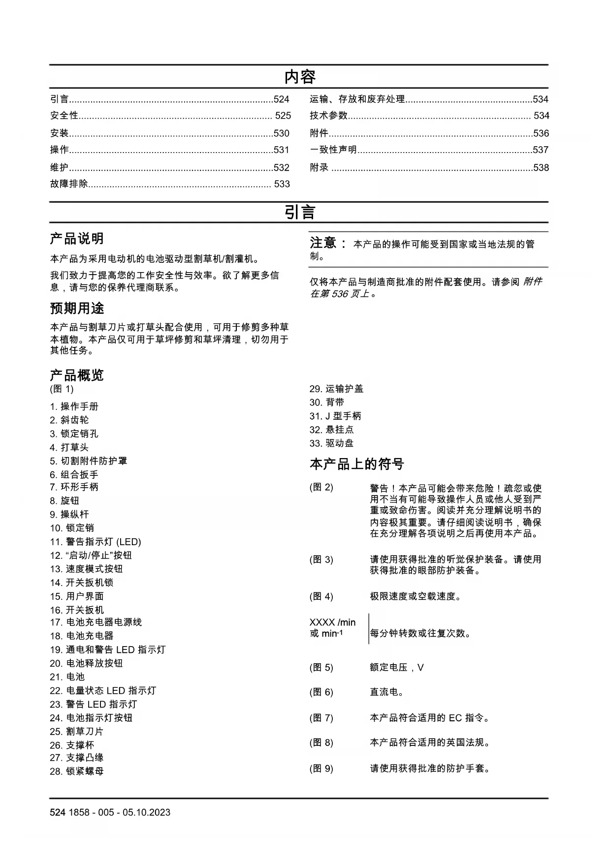 (图 7) 本产品符合适用的 EC 指令。 (图 8) 本产品符合适用的英国法规。 (图 9) 请使用获得批准的防护手套。 524 1858 - 005 - 05.10.2023(图 10) 请穿上结实、防滑的安全鞋。 (图 11)