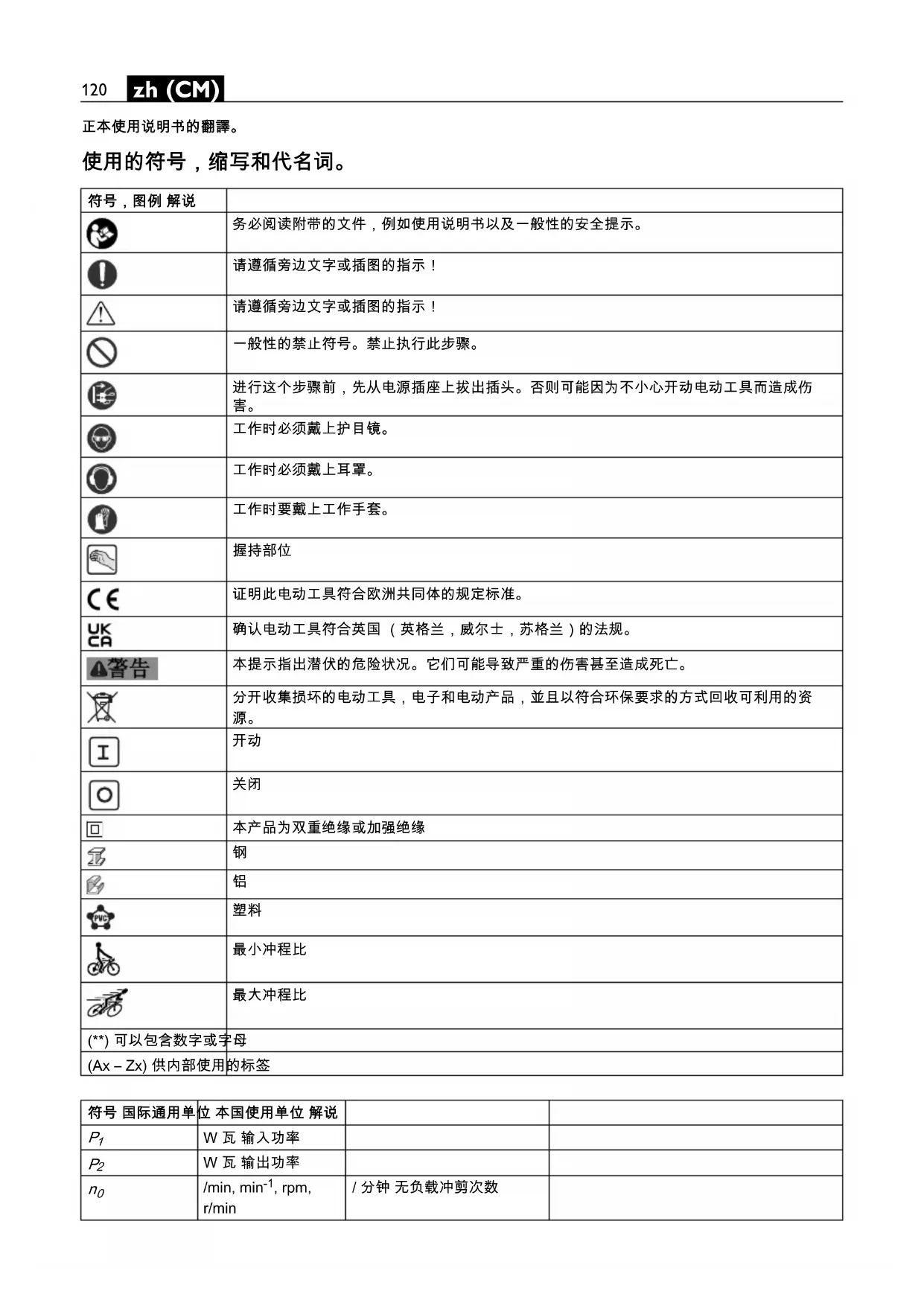 证明此电动工具符合欧洲共同体的规定标准。 确认电动工具符合英国 (英格兰,威尔士,苏格兰)的法规。 本提示指出潜伏的危险状况。它们可能导致严重的伤害甚至造成死亡。 分开收集损坏的电动工具,电子和电动产品,並且以符合环保要求的方式回收可利用的资