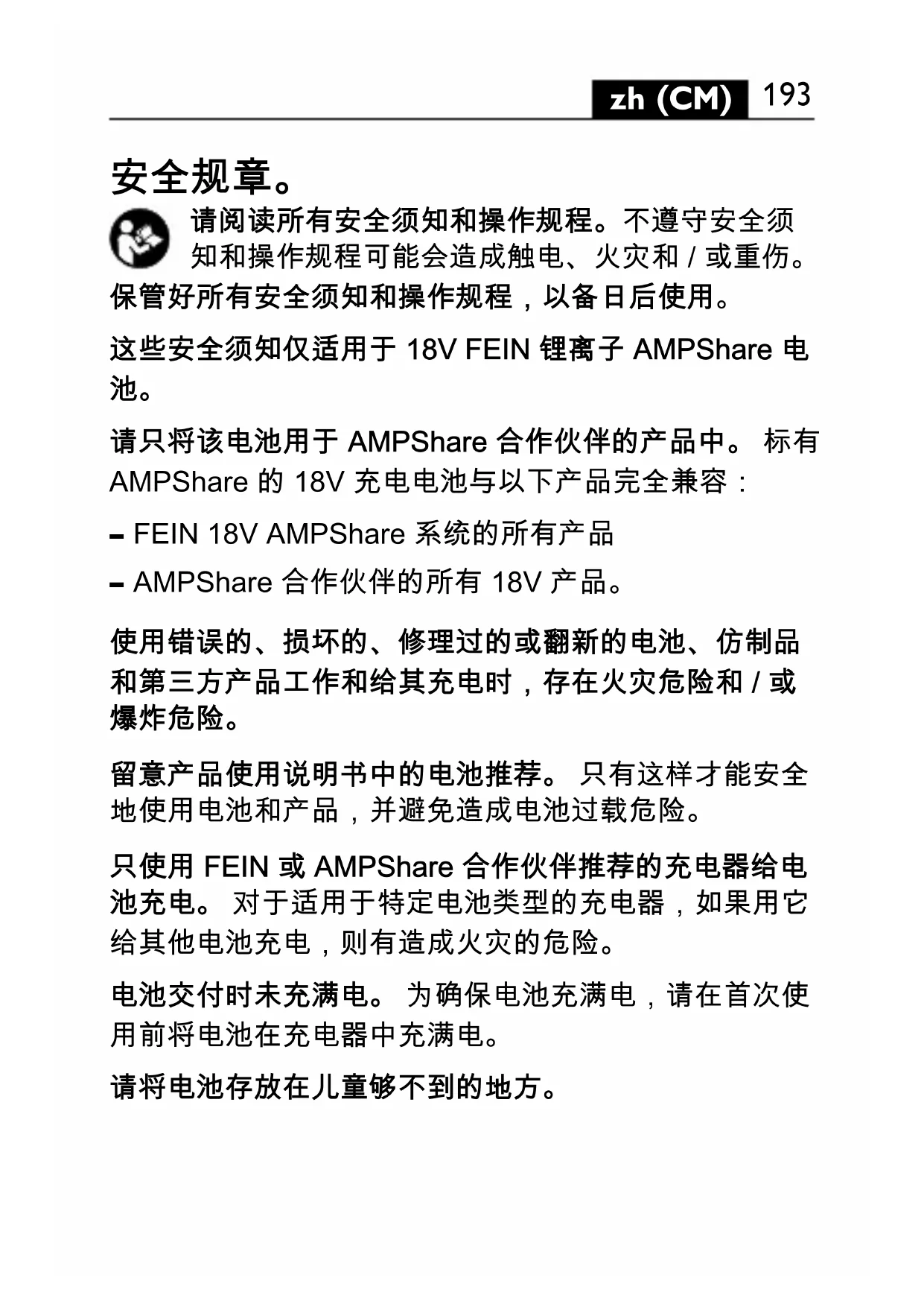 请阅读所有安全须知和操作规程。不遵守安全须 知和操作规程可能会造成触电、火灾和 / 或重伤。 保管好所有安全须知和操作规程,以备日后使用。 这些安全须知仅适用于 18V FEIN 锂离子 AMPShare 电