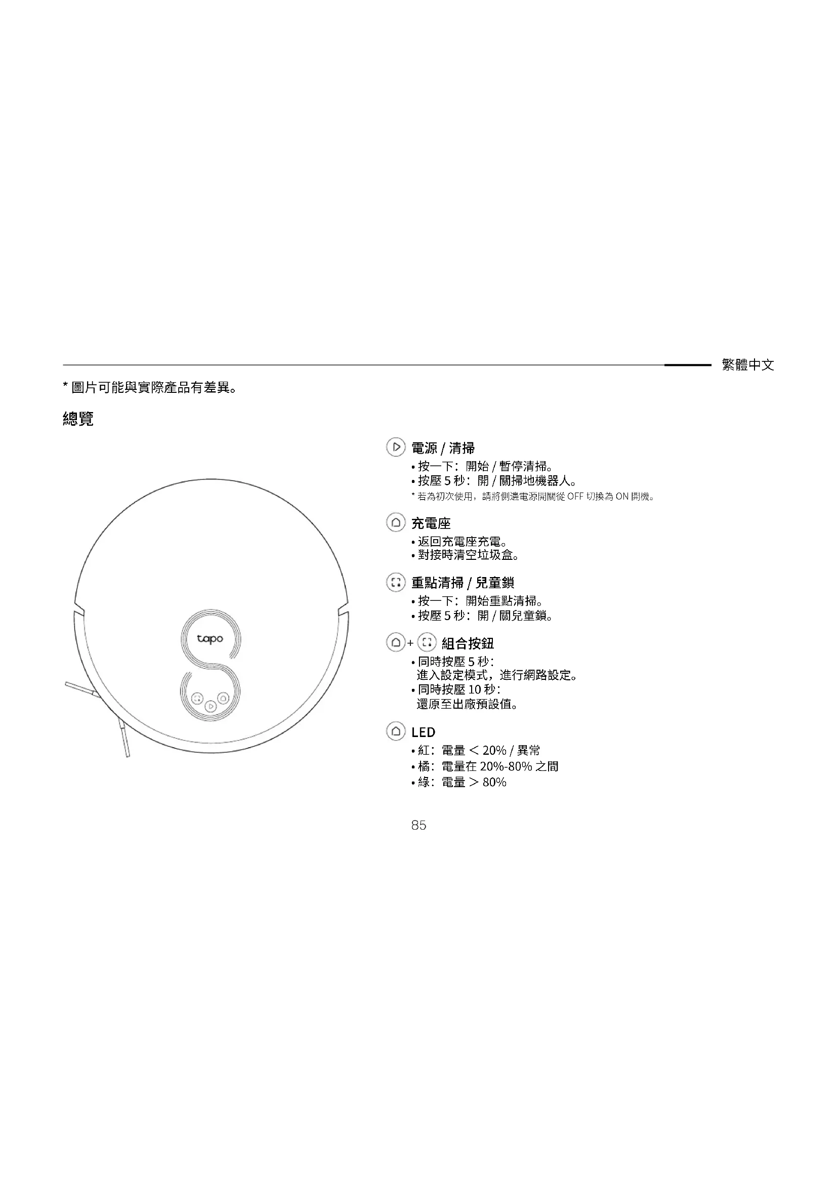 避免更換不正確的電池,以免破壞機器的安全措施。將電池丟在火源或烤箱、機械擠壓或切割電池會有爆炸風險。 請勿將電池放置在可能導致爆炸或易燃液體或氣體洩漏的高溫環境中;請勿將電池置於極低的氣壓下,否則可能導致爆炸或易燃液體/氣體洩漏。 說明書需聲明以下內容: 本設備不適合身體、感官或精神能力下降或缺乏經驗和知識的人(包括兒童)使用,除非他們已由負責其安全的人員對設備的使用進行監督或指導。 應監督兒童,確保他們不會把玩本設備。 本設備只能與包裝隨附的電源配件一起使用。 警告:若要幫電池充電,只能使用設備包裝內附的可充電配件。 (對於 Tapo RV30 系列)本設備包含一個 5000mAh 鋰離子電池。 (對於 Tapo RV10 系列)本設備包含一個 2600mAh 鋰離子電池。(對於 Tapo RV30C 系列)本設備包含一個 3200mAh 鋰離子電池。 本設備可供 8 歲以上的兒童,以及身體、感官或精神能力下降或缺乏經驗和知識的人使用,前提是他們已接受以安全方式使用本設備的監督或指導,並了解危險和風險。兒童不得把玩本設備且在無成人在旁監督 的情況下,不得讓孩童清潔與維護產品。