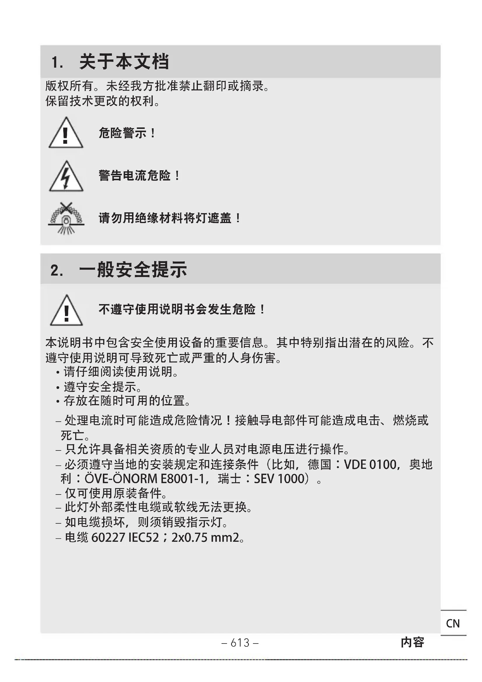 – 仅可使用原装备件。 – 此灯外部柔性电缆或软线无法更换。 – 如电缆损坏,则须销毁指示灯。 – 电缆60227IEC52;2x0.75mm2。– 614 –