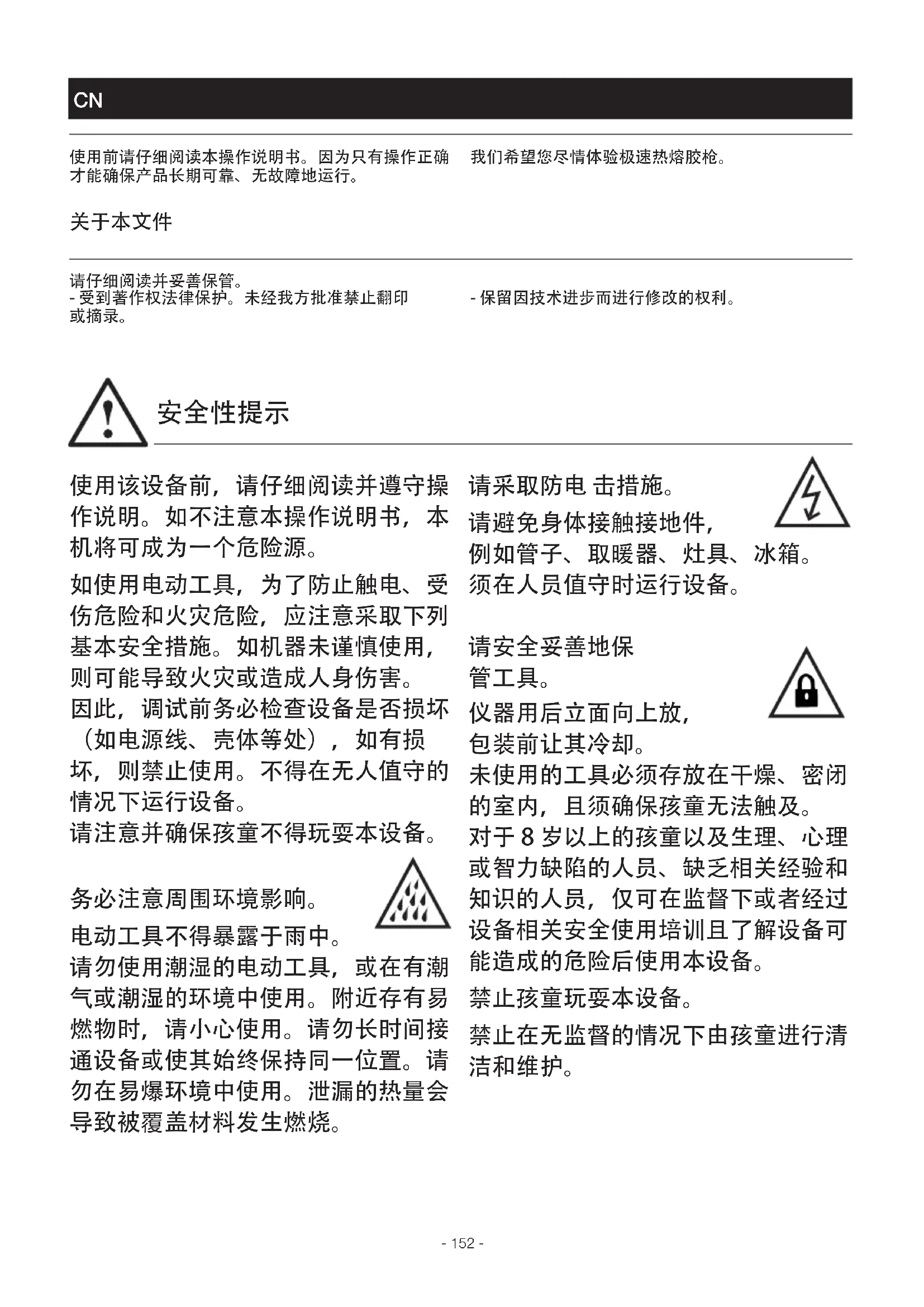 使用前请仔细阅读本操作说明书。因为只有操作正确 才能确保产品长期可靠、无故障地运行。 我们希望您尽情体验极速热熔胶枪。 CN使用说明书原件