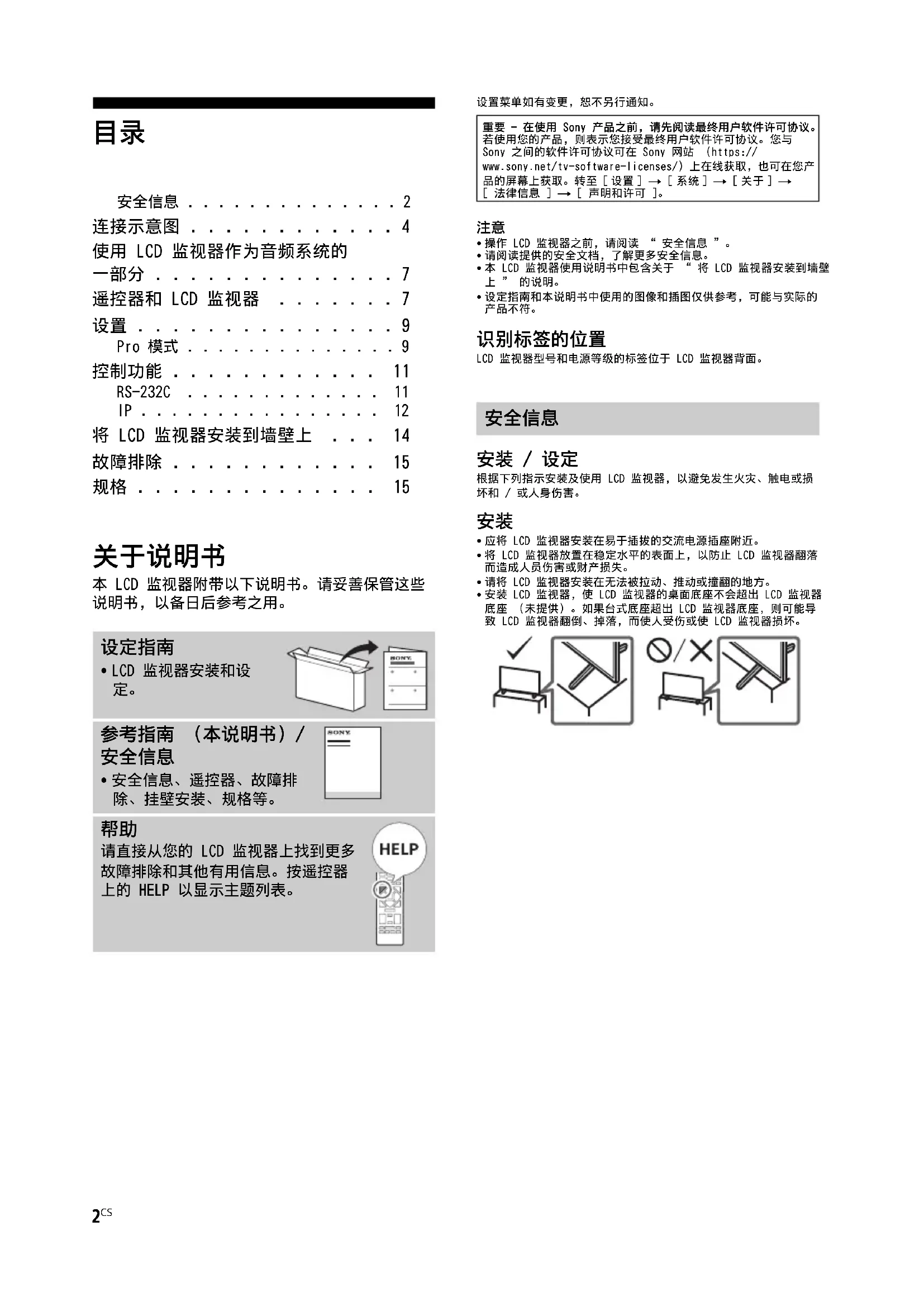 请直接从您的 LCD 监视器上找到更多 故障排除和其他有用信息。按遥控器 上的 HELP 以显示主题列表。 重要 - 在使用 Sony 产品之前,请先阅读最终用户软件许可协议。若使用您的产品,则表示您接受最终用户软件许可协议。您与 Sony 之间的软件许可协议可在 Sony 网站 (https://www.sony.net/tv-software-licenses/)上在线获取,也可在您产 品的屏幕上获取。转至 [ 设置 ] t [ 系统 ] t [ 关于 ] t [ 法律信息 ] t [ 声明和许可 ]。 安全信息D:\@ Jobs\SY23_B2B_PA_RG_141\5049502141_02CSSG\5049502141_02CSSG.fm master page: Right FW-98BZ53L / 98BZ50L / 98BZ30L / 85BZ40L / 85BZ30L / 75BZ40L / 75BZ35L / 75BZ30L / 65BZ40L / 65BZ35L / 65BZ30L / 55BZ40L / 55BZ35L / 55BZ30L / 50BZ30L / 43BZ30L 5-049-502-14(1)