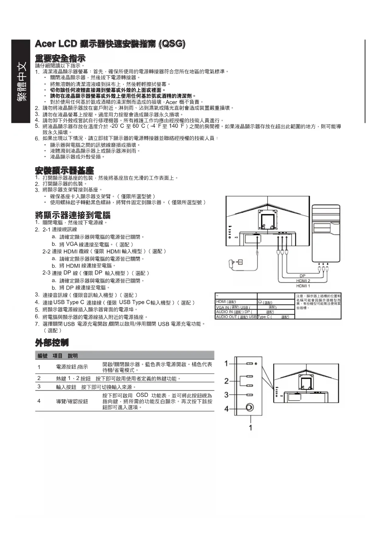 Acer 產品的手冊和其他文件。 557,0 (寬) x 384,1-504,1 (高) x 234,0 (深) 公釐 4,45 公斤 (淨重) HDMI: 31.469-270.000KHz )DP: 31.469-281.250KHz (超頻 DP: 1920x1080 @250Hz
