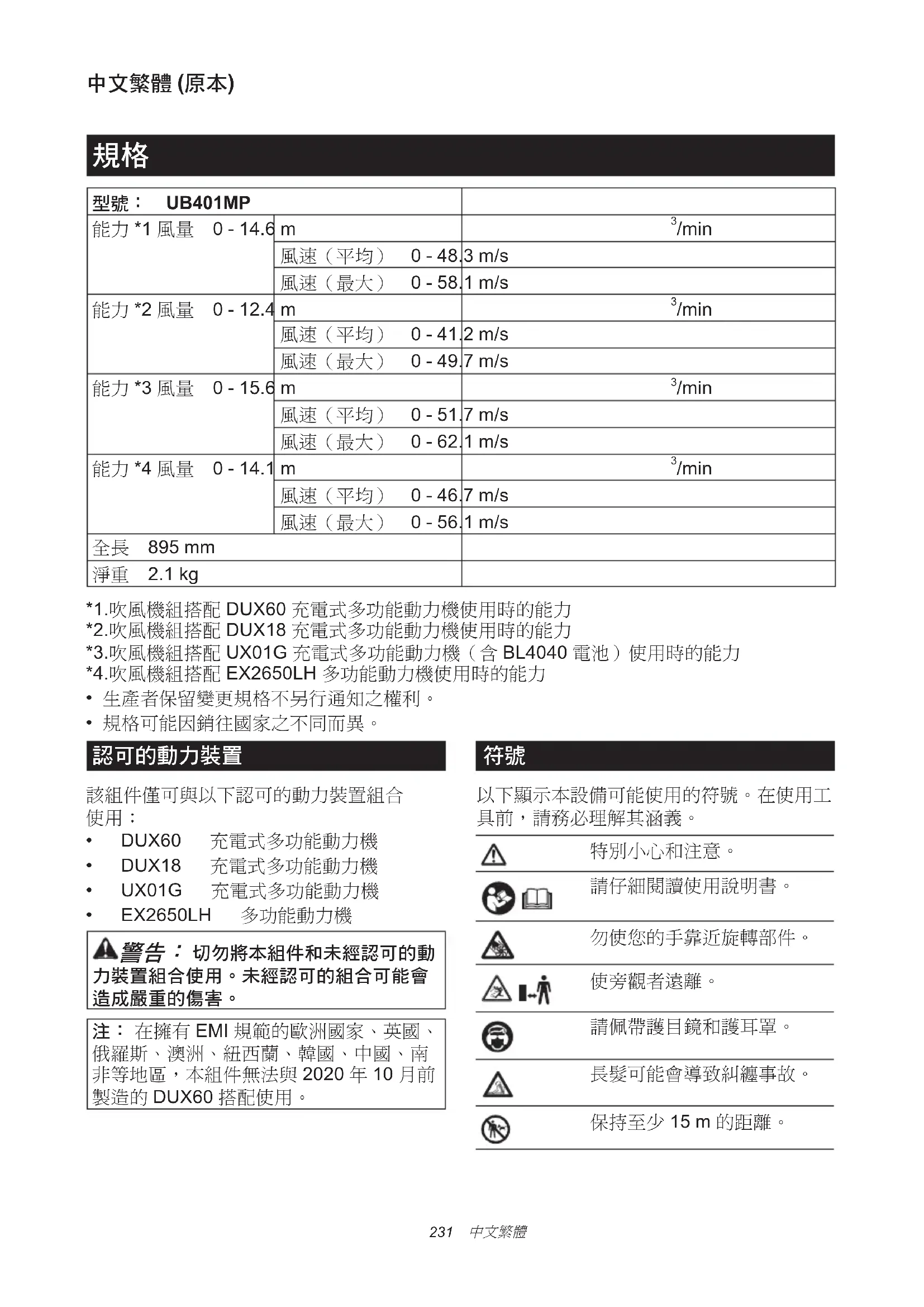 /min 風速(平均) 0 - 46.7 m/s 風速(最大) 0 - 56.1 m/s 全長 895 mm 淨重 2.1 kg *1.吹風機組搭配 DUX60 充電式多功能動力機使用時的能力 *2.吹風機組搭配 DUX18 充電式多功能動力機使用時的能力 *3.吹風機組搭配 UX01G 充電式多功能動力機(含 BL4040 電池)使用時的能力 *4.吹風機組搭配 EX2650LH 多功能動力機使用時的能力