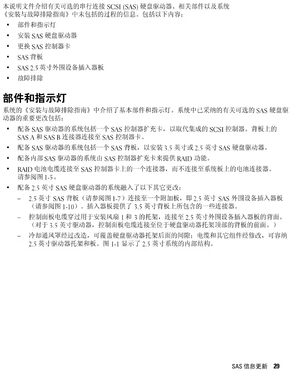 排除 SAS 控制器卡故障 . . . . . . . . . . . . . . . . . . . . . 4728 目录SAS 信息更新 29 本说明文件介绍有关可选的串行连接 SCSI (SAS) 硬盘驱动器、相关部件以及系统 《安装与故障排除指南》中未包括的过程的信息。包括以下内容: