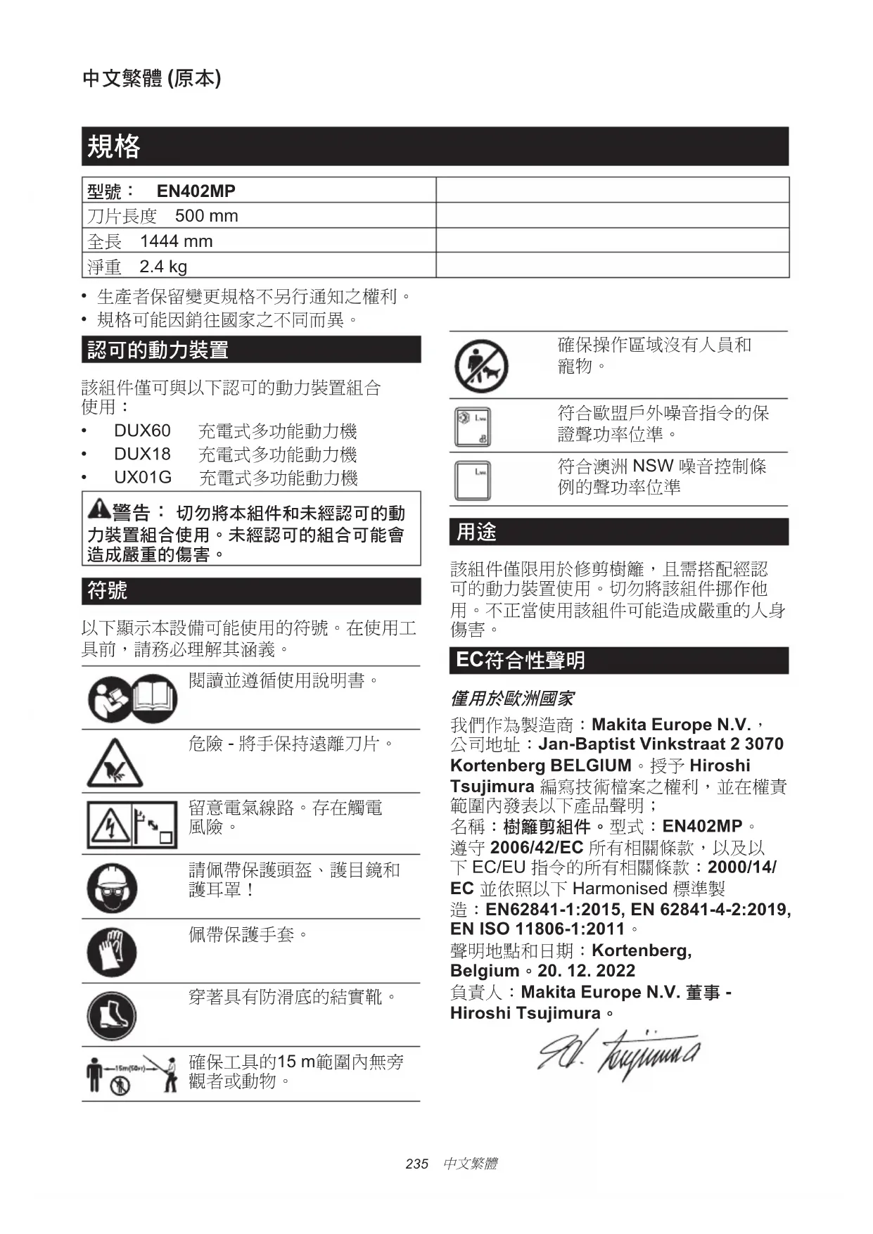 我們作為製造商:Makita Europe N.V., 公司地址:Jan-Baptist Vinkstraat 2 3070 Kortenberg BELGIUM。授予 Hiroshi Tsujimura 編寫技術檔案之權利,並在權責 範圍內發表以下產品聲明; 名稱:樹籬剪組件。型式:EN402MP。 遵守 2006/42/EC 所有相關條款,以及以 下 EC/EU 指令的所有相關條款:2000/14/ EC 並依照以下 Harmonised 標準製 造:EN62841-1:2015, EN 62841-4-2:2019,