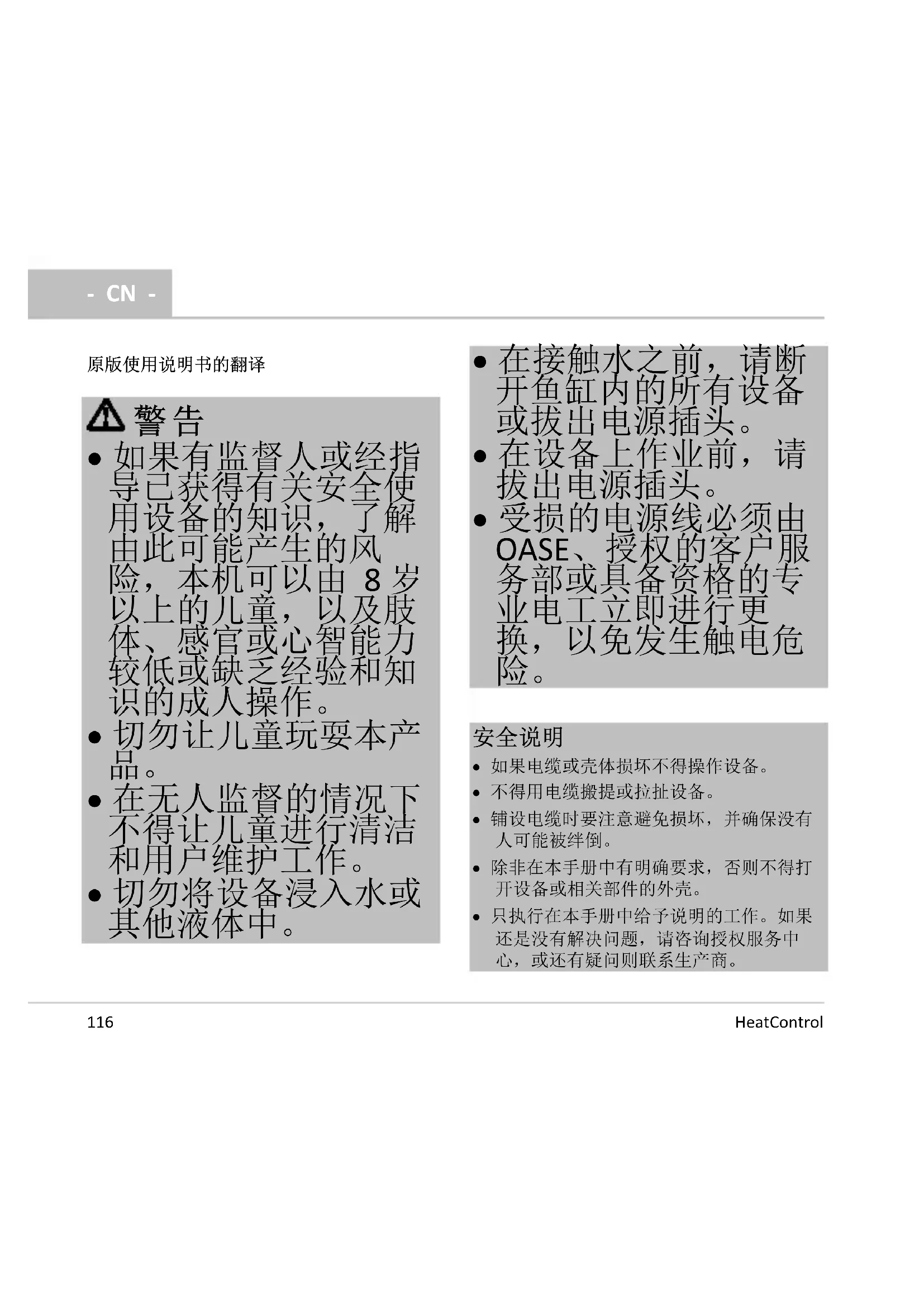 - 只使用允许在鱼缸中使用的加热器。合适 的加热器满足 EN 60335-2-55 规定的要求。