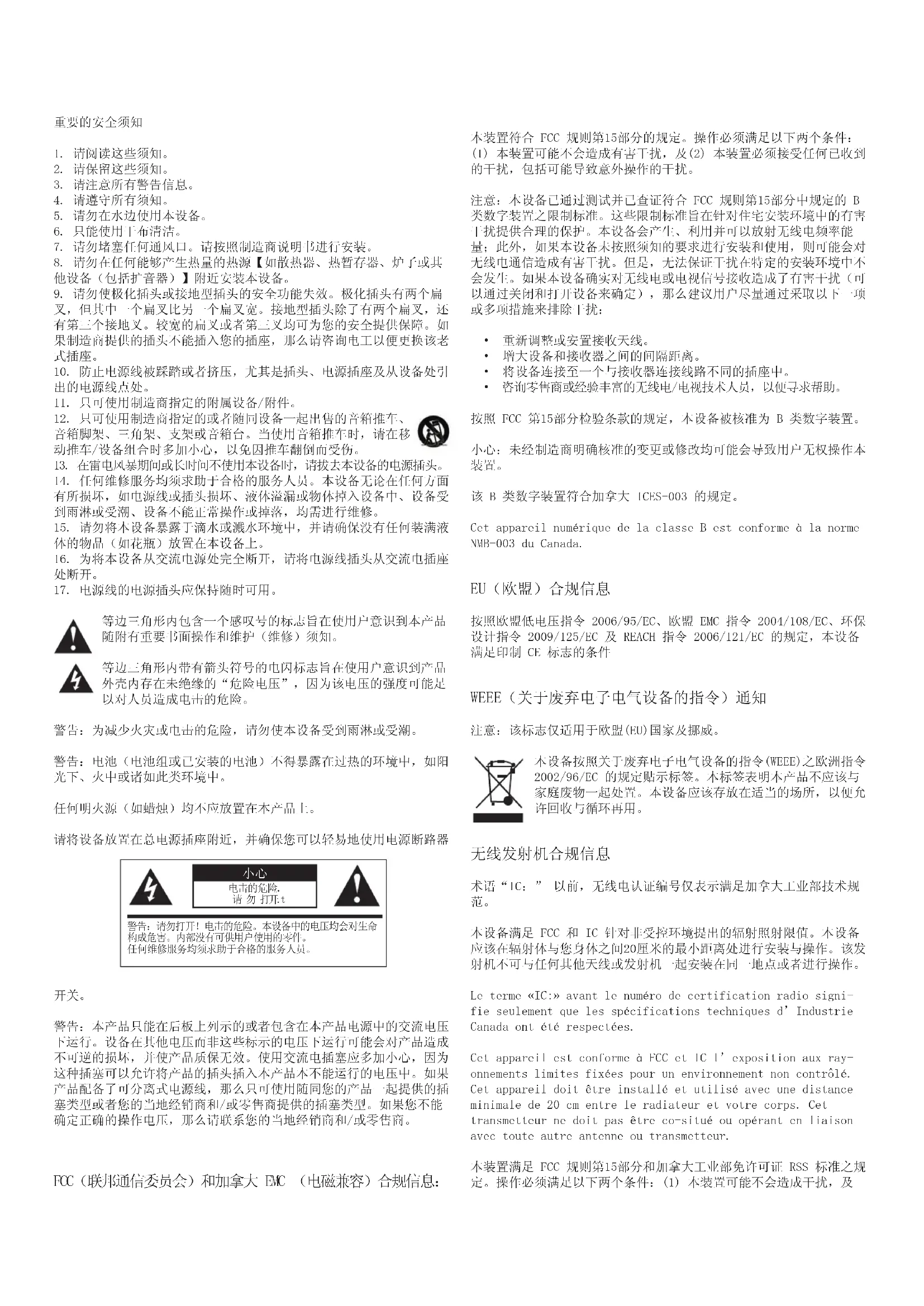 警告:本产品只能在后板上列示的或者包含在本产品电源中的交流电压 下运行。设备在其他电压而非这些标示的电压下运行可能会对产品造成 不可逆的损坏,并使产品质保无效。使用交流电插塞应多加小心,因为 这种插塞可以允许将产品的插头插入本产品本不能运行的电压中。如果 产品配备了可分离式电源线,那么只可使用随同您的产品一起提供的插 塞类型或者您的当地经销商和/或零售商提供的插塞类型。如果您不能 确定正确的操作电压,那么请联系您的当地经销商和/或零售商。 FCC(联邦通信委员会)和加拿大 EMC (电磁兼容)合规信息: 本装置符合 FCC 规则第15部分的规定。操作必须满足以下两个条件: (1) 本装置可能不会造成有害干扰,及(2) 本装置必须接受任何已收到 的干扰,包括可能导致意外操作的干扰。 注意:本设备已通过测试并已查证符合 FCC 规则第15部分中规定的 B 类数字装置之限制标准。这些限制标准旨在针对住宅安装环境中的有害 干扰提供合理的保护。本设备会产生、利用并可以放射无线电频率能 量;此外,如果本设备未按照须知的要求进行安装和使用,则可能会对 无线电通信造成有害干扰。但是,无法保证干扰在特定的安装环境中不 会发生。如果本设备确实对无线电或电视信号接收造成了有害干扰(可 以通过关闭和打开设备来确定),那么建议用户尽量通过采取以下一项 或多项措施来排除干扰: