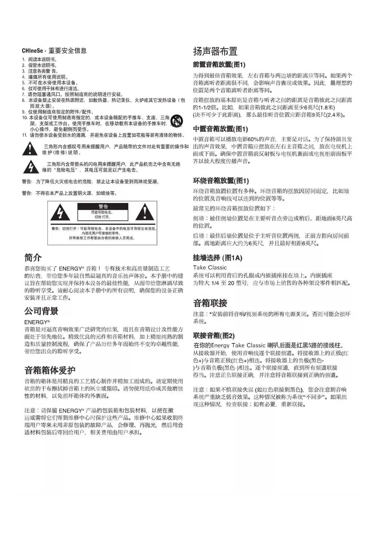 在你的Energy Take Classic 喇叭后面是红黑5路的接线柱。 Take Classic加拿大和美国境外的保修 若此产品售至美国和加拿大以外的国家,其保修需遵守适用的法律。若希望获得 适用保修服务,请致电购机经销商,或联系此产品的分销商。 FCC 与加拿大 EMC 合规信息 注:此设备经过测试,符合《FCC 规定》的第 15 部分对“B 类”数字设备的限定。 制定此类限定旨在对住宅安装的设备提供合理的保护,避免有害干扰。此设备会 产生、使用并能发射射频能量,如果未按照指示信息安装和使用,可能对无线电通 信造成有害干扰。尽管如此,不保证具体的安装不会发生干扰。如果本设备对无线 电或电视接收造成有害干扰(可通过关闭和打开本设备来判定),用户可采取以下 一项或多项措施来消除干扰: