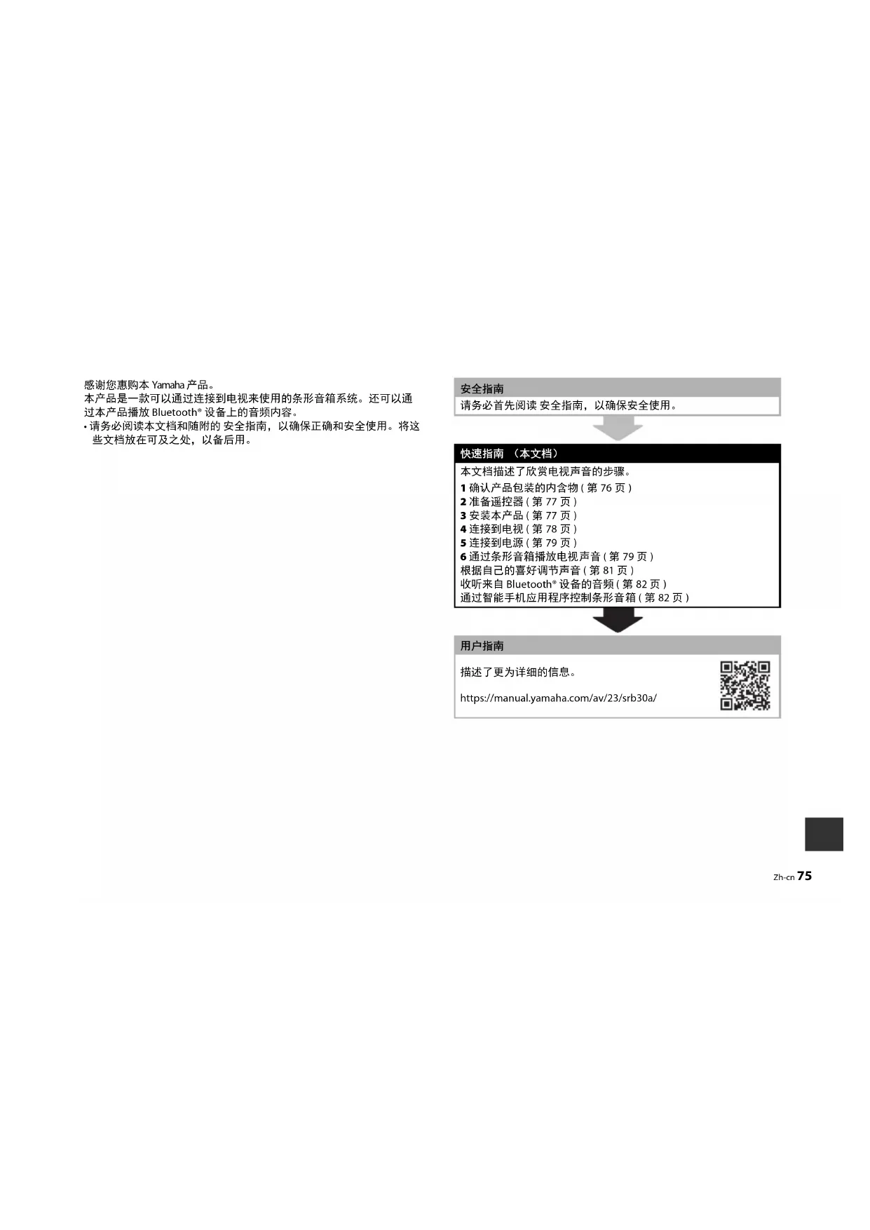 本文档描述了欣赏电视声音的步骤。 1 确认产品包装的内含物 ( 第 76 页 ) 2 准备遥控器 ( 第 77 页 ) 3 安装本产品 ( 第 77 页 ) 4 连接到电视 ( 第 78 页 ) 5 连接到电源 ( 第 79 页 ) 6 通过条形音箱播放电视声音 ( 第 79 页 ) 根据自己的喜好调节声音 ( 第 81 页 ) 收听来自 Bluetooth® 设备的音频 ( 第 82 页 ) 通过智能手机应用程序控制条形音箱 ( 第 82 页 )