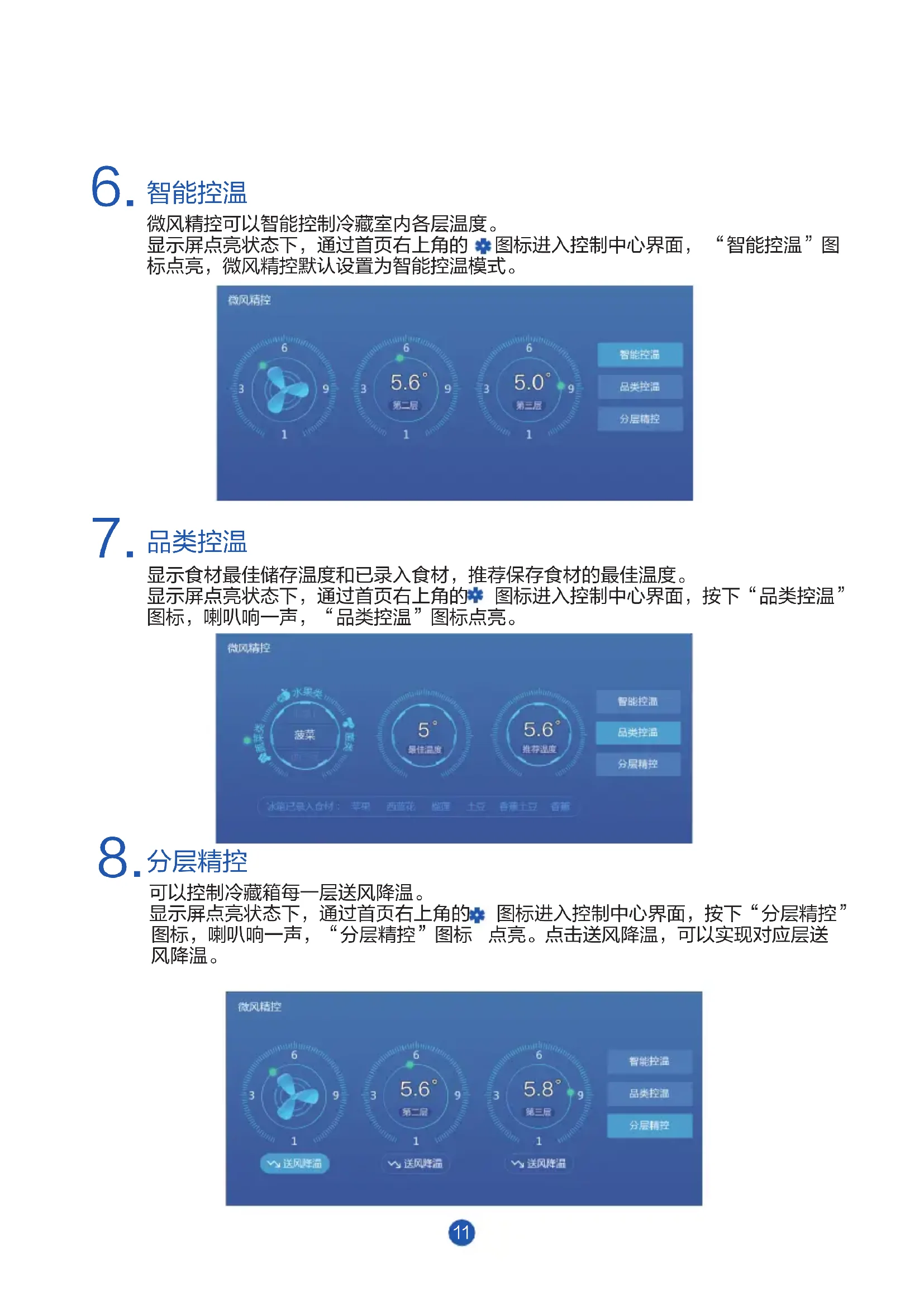 微风精控可以智能控制冷藏室内各层温度。 显示屏点亮状态下,通过首页右上角的图标进入控制中心界面,“智能控温”图 标点亮,微风精控默认设置为智能控温模式。