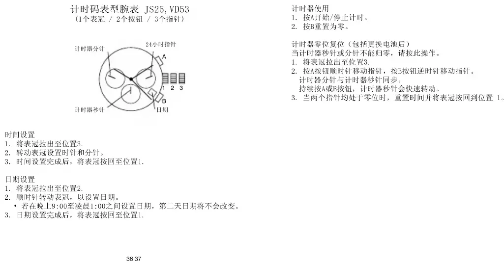 请注意: 此为Michael Kors系列最常被采用的机芯,如需要详细说明,欢迎浏览 www.michaelkors.com36 37 计时码表型腕表 JS25,VD53 (1个表冠 / 2个按钮 / 3个指针)