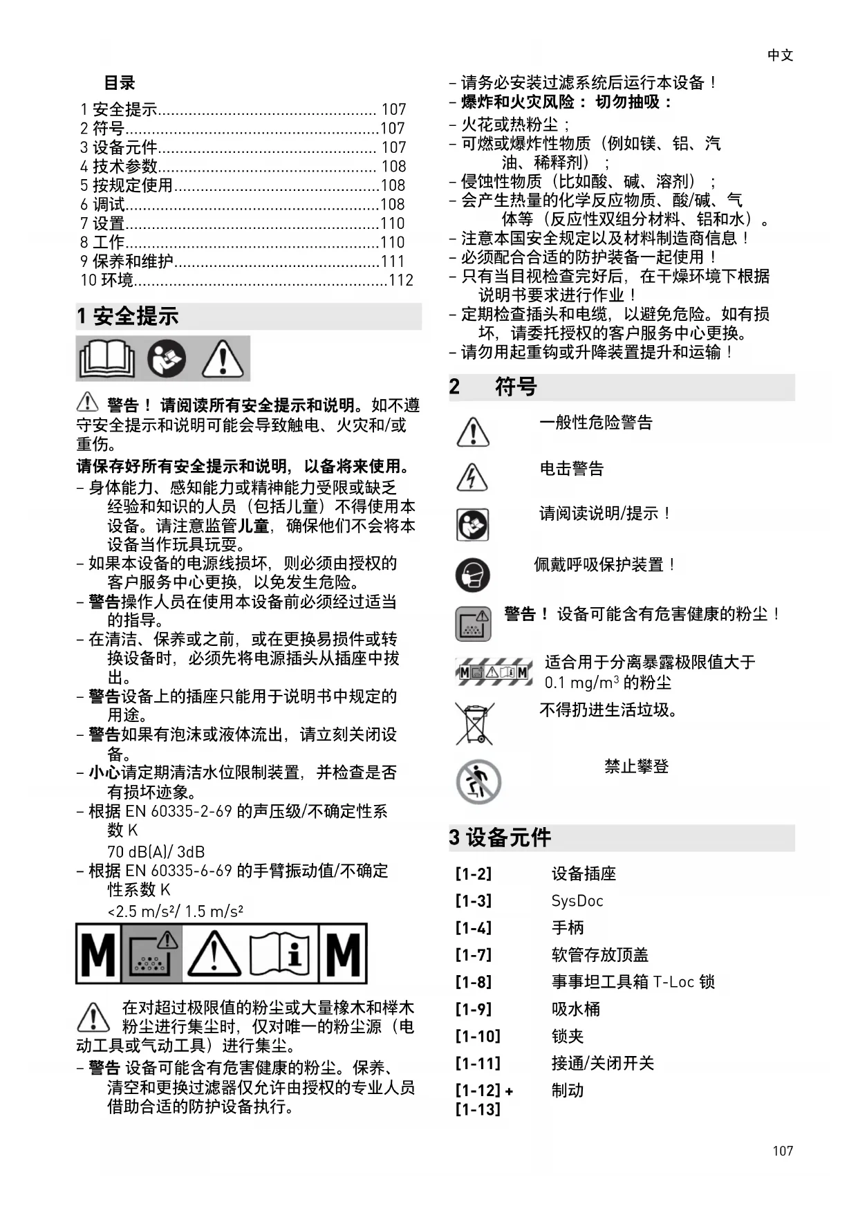 – 根据 EN 60335-2-69 的声压级/不确定性系 数 K 70 dB(A)/ 3dB – 根据 EN 60335-6-69 的手臂振动值/不确定 性系数 K <2.5 m/s²/ 1.5 m/s² 在对超过极限值的粉尘或大量橡木和榉木 粉尘进行集尘时,仅对唯一的粉尘源(电 动工具或气动工具)进行集尘。 – 警告 设备可能含有危害健康的粉尘。保养、 清空和更换过滤器仅允许由授权的专业人员 借助合适的防护设备执行。 – 请务必安装过滤系统后运行本设备! – 爆炸和火灾风险: 切勿抽吸: