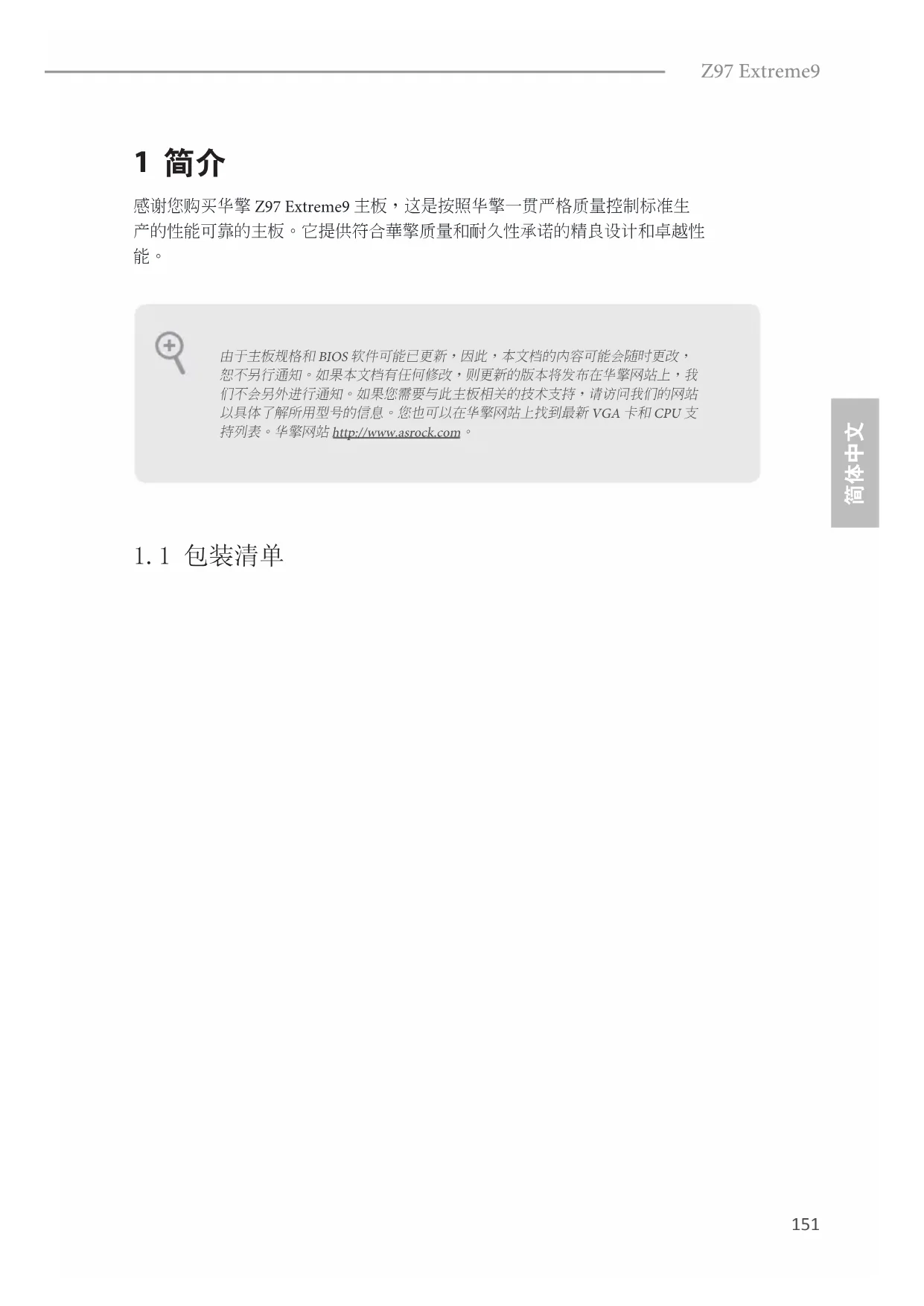 1 简介 感谢您购买华擎 Z97 Extreme9 主板,这是按照华擎一贯严格质量控制标准生 产的性能可靠的主板。它提供符合華擎质量和耐久性承诺的精良设计和卓越性