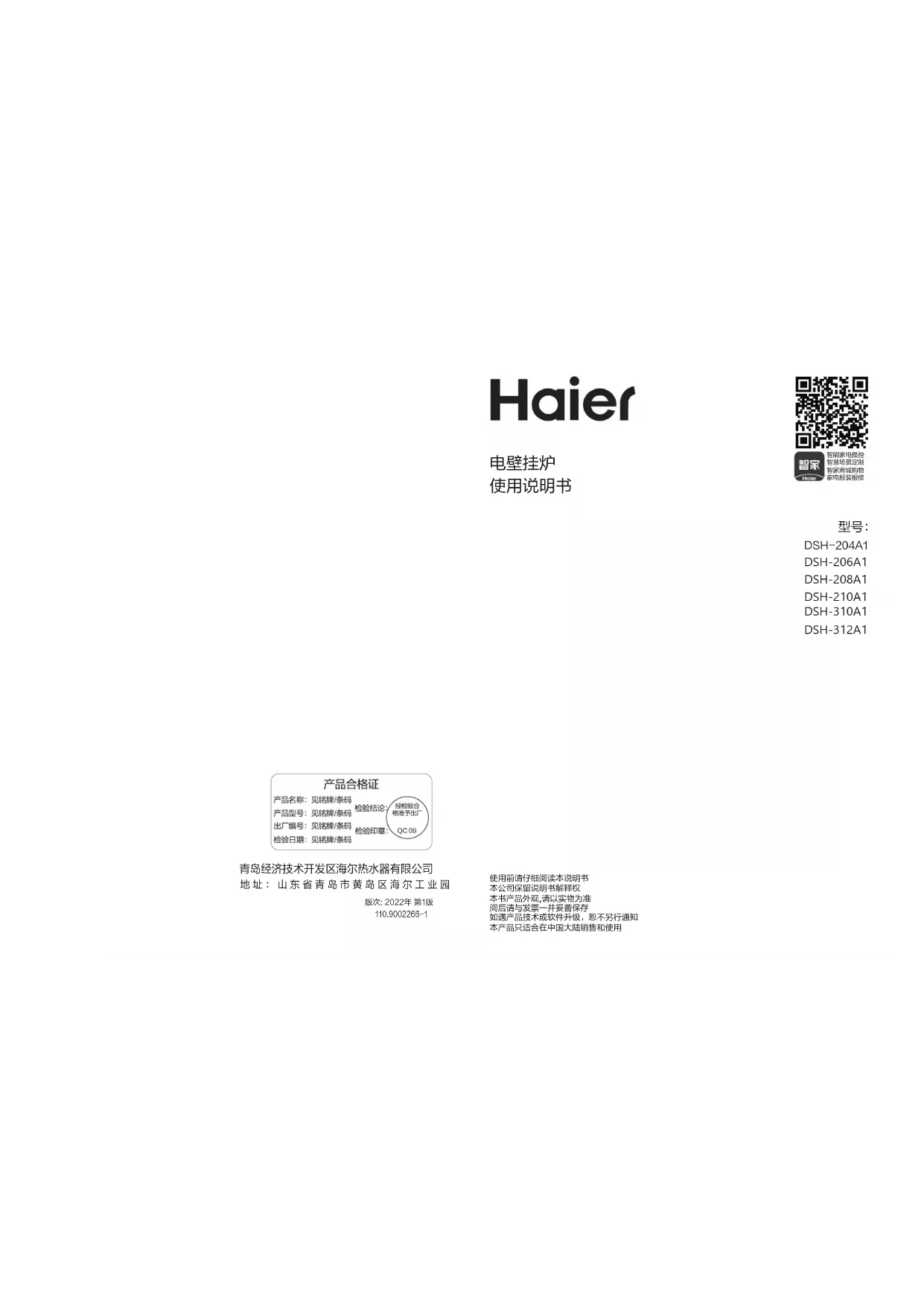 智能家电操控智慧场景定制智家商城购物家电报装报修 DSH-206A1 DSH-204A1 DSH-210A1 DSH-208A1 DSH-310A1 DSH-312A1 地 址 : 山 东 省 青 岛 市 黄 岛 区 海 尔 工 业 园 青岛经济技术开发区海尔热水器有限公司 版次: 2022年 第1版110.9002266-1尊敬的海尔用户: 感谢您选择、使用海尔电壁挂炉。 海尔产品质量优,性能佳。为了方便您使用,请仔细阅读说明书,并按照说明书的步骤 作。阅后妥善保存说明书。自始至终,海尔的“星级服务”将伴随着您,使用时无论有什么 问题,请按说明书上的电话、地址联系,我们时刻恭候为您服务。 The future is NOW! 再次感谢您选择使用海尔产品,由于产品的改进,您所得到的海尔电壁挂炉可能与说明 书中图示不完全一致,谨此致歉。
