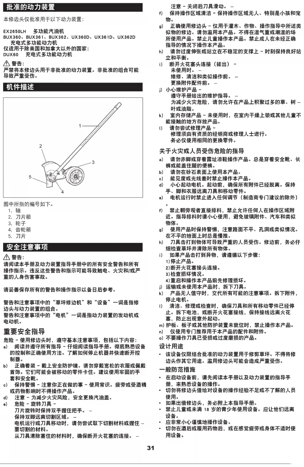 本修边头仅批准用于以下动力装置: EX2650LH 多功能汽油机 BUX360、BUX361、BUX362、UX360D、UX361D、UX362D