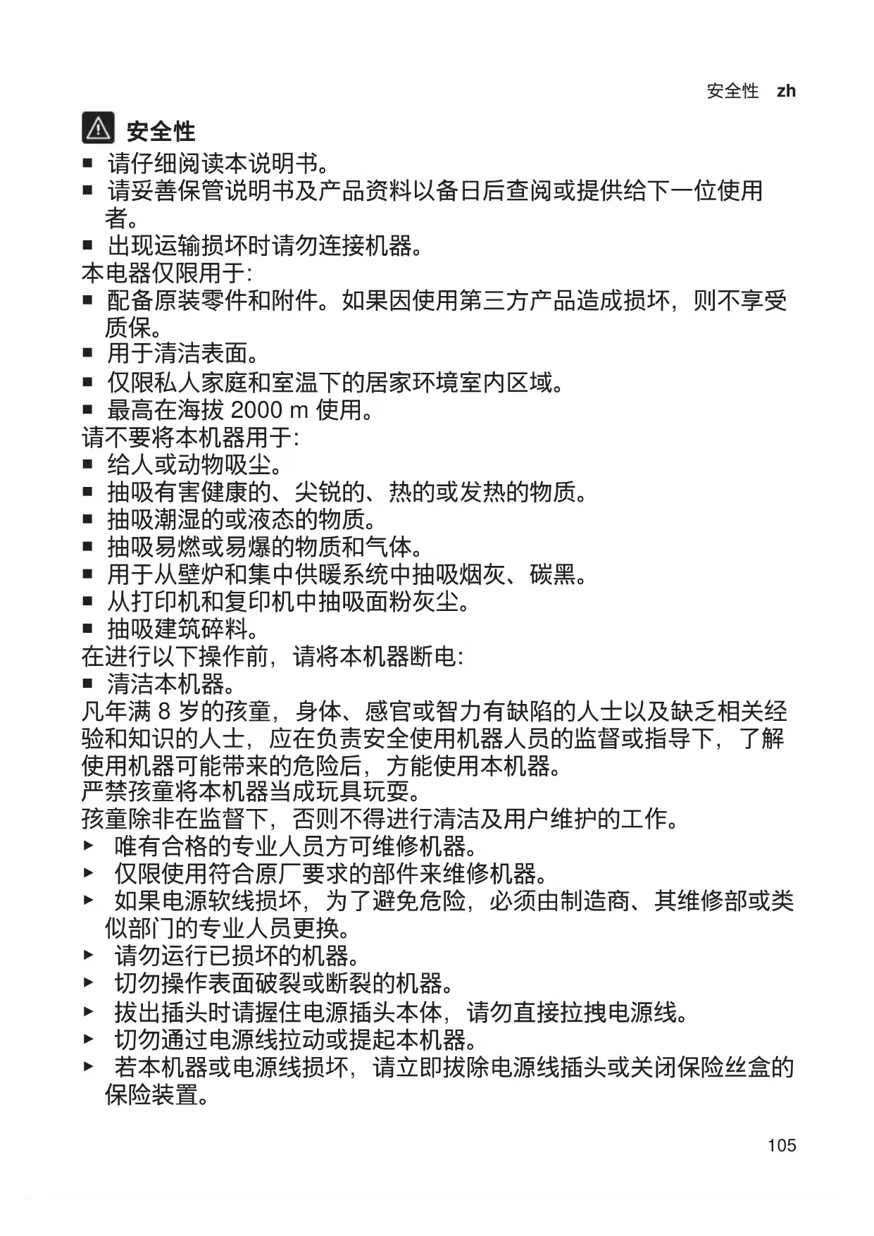 ¡ 抽吸有害健康的、尖锐的、热的或发热的物质。 ¡ 抽吸潮湿的或液态的物质。 ¡ 抽吸易燃或易爆的物质和气体。 ¡ 用于从壁炉和集中供暖系统中抽吸烟灰、碳黑。 ¡ 从打印机和复印机中抽吸面粉灰尘。