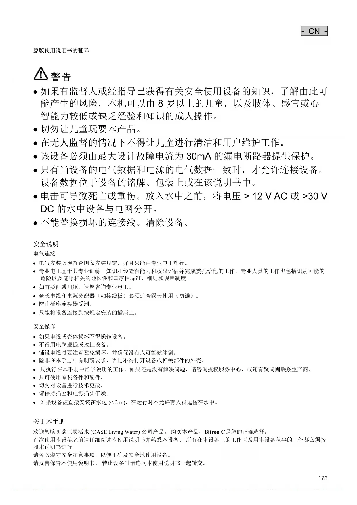 欢迎您购买欧亚瑟活水 (OASE Living Water) 公司产品。 购买本产品,Bitron C是您的正确选择。 首次使用本设备之前请仔细阅读本使用说明书并熟悉本设备。 所有在本设备上的工作以及用本设备从事的工作都必须按