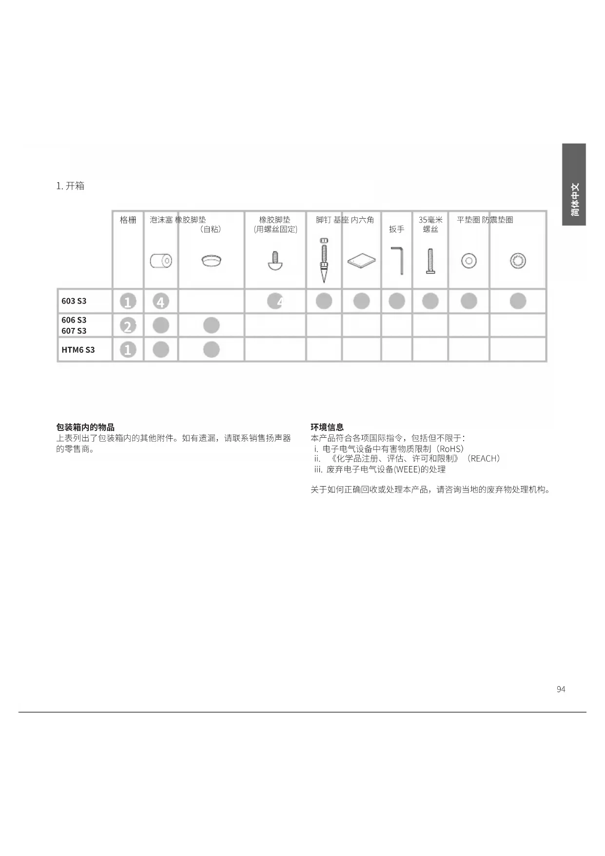 上表列出了包装箱内的其他附件。如有遗漏,请联系销售扬声器