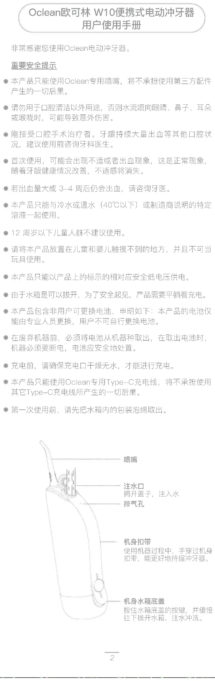 本产品只能以产品上的标示的相对应安全低电压供电。 由于水箱是可以拔开,为了安全起见,产品需要平躺着充电。 本产品包含非用户可更换电池,申明如下:本产品的电池仅 能由专业人员更换,用户不可自行更换电池。 在废弃机器前,必须将电池从机器种取出,在取出电池时, 机器必须要断电,电池应安全地处置。 充电前,请确保充电口干燥无水,才能进行充电。 本产品只能使用Oclean专用Type-C充电线,将不承担使用 其它Type-C充电线所产生的一切后果。 第一次使用前,请先把水箱内的包装泡绵取出。 Oclean欧可林 W10便携式电动冲牙器
