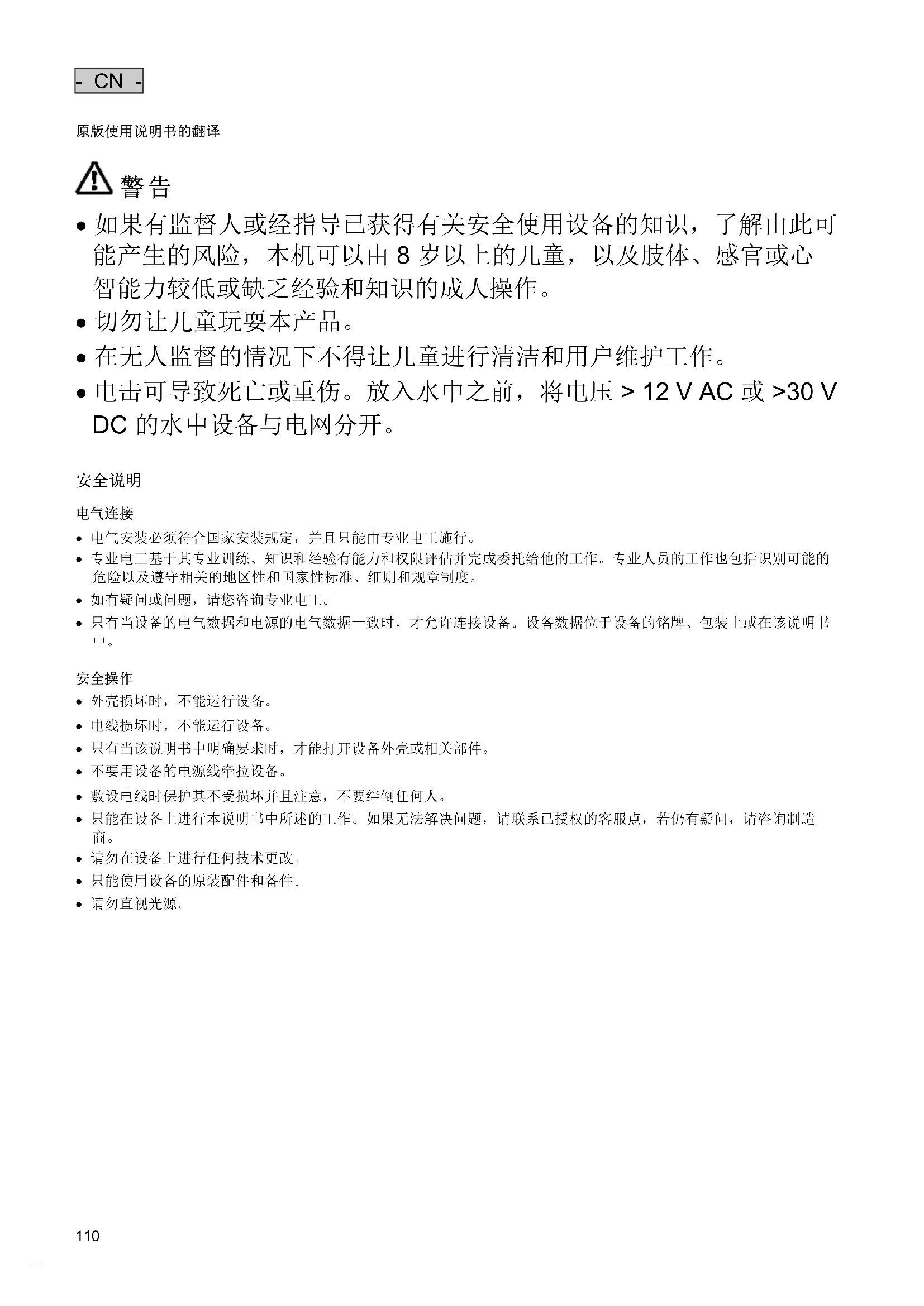 - 如果有监督人或经指导已获得有关安全使用设备的知识,了解由此可 能产生的风险,本机可以由 8 岁以上的儿童,以及肢体、感官或心 智能力较低或缺乏经验和知识的成人操作。
