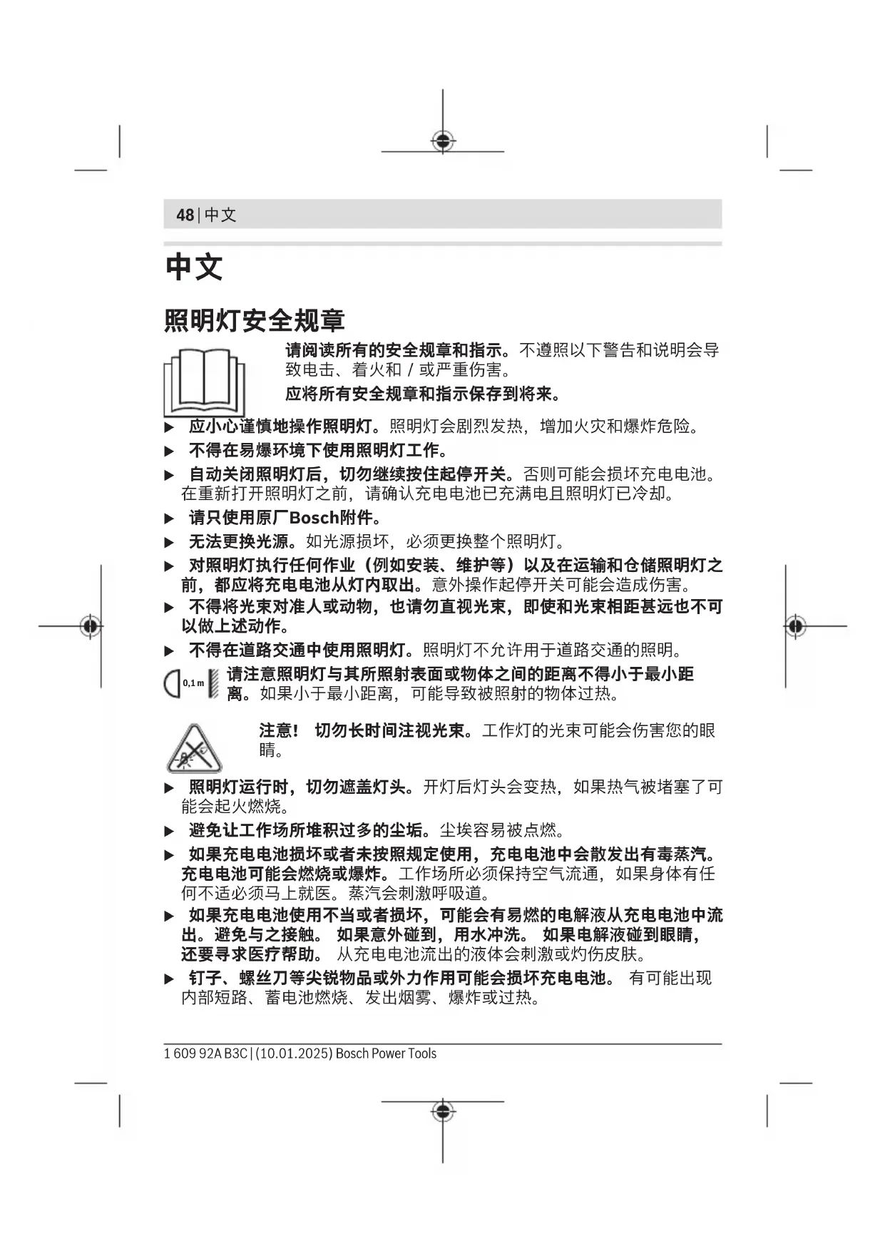 请阅读所有的安全规章和指示。不遵照以下警告和说明会导 致电击、着火和/或严重伤害。 应将所有安全规章和指示保存到将来。 u 应小心谨慎地操作照明灯。照明灯会剧烈发热,增加火灾和爆炸危险。 u 不得在易爆环境下使用照明灯工作。 u 自动关闭照明灯后,切勿继续按住起停开关。否则可能会损坏充电电池。 在重新打开照明灯之前,请确认充电电池已充满电且照明灯已冷却。 u 请只使用原厂Bosch附件。 u 无法更换光源。如光源损坏,必须更换整个照明灯。 u 对照明灯执行任何作业(例如安装、维护等)以及在运输和仓储照明灯之 前,都应将充电电池从灯内取出。意外操作起停开关可能会造成伤害。 u 不得将光束对准人或动物,也请勿直视光束,即使和光束相距甚远也不可