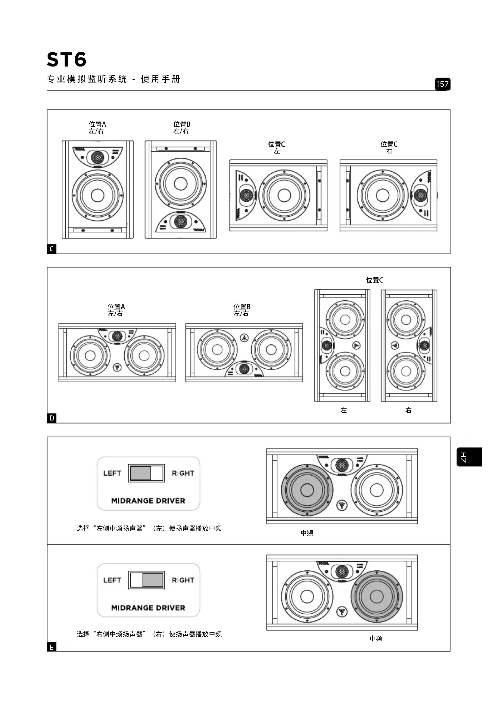Solo6、Twin6和Trio6是近距监听音箱,应朝向听音者,摆放在与其距离1米至3米之间。您完全可以将其摆放在调音台顶部或者合适的支架 上;无论如何,强烈建议高音扬声器距离地面的高度要接近听音者耳朵的高度。必要情况下,完全可以将音箱倒置,使高音扬声器位于下 方,以便满足上述规则(图C、D)。 Solo6可以根据环境垂直或水平放置(图C),最好朝向听众。但是,我们不建议垂直放置。 由于设计原因,Twin6更适合水平放置,但在特定情况下可以垂直放置。Twin6带有可选择中频扬声器位置的开关(参见“使用 - 控制 - 左/ 右中频扬声器开关”) - (图E)。因此,始终选择相对于听众的“对称”或“镜像”配置。165 ST6 专业模拟监听系统 - 使用手册