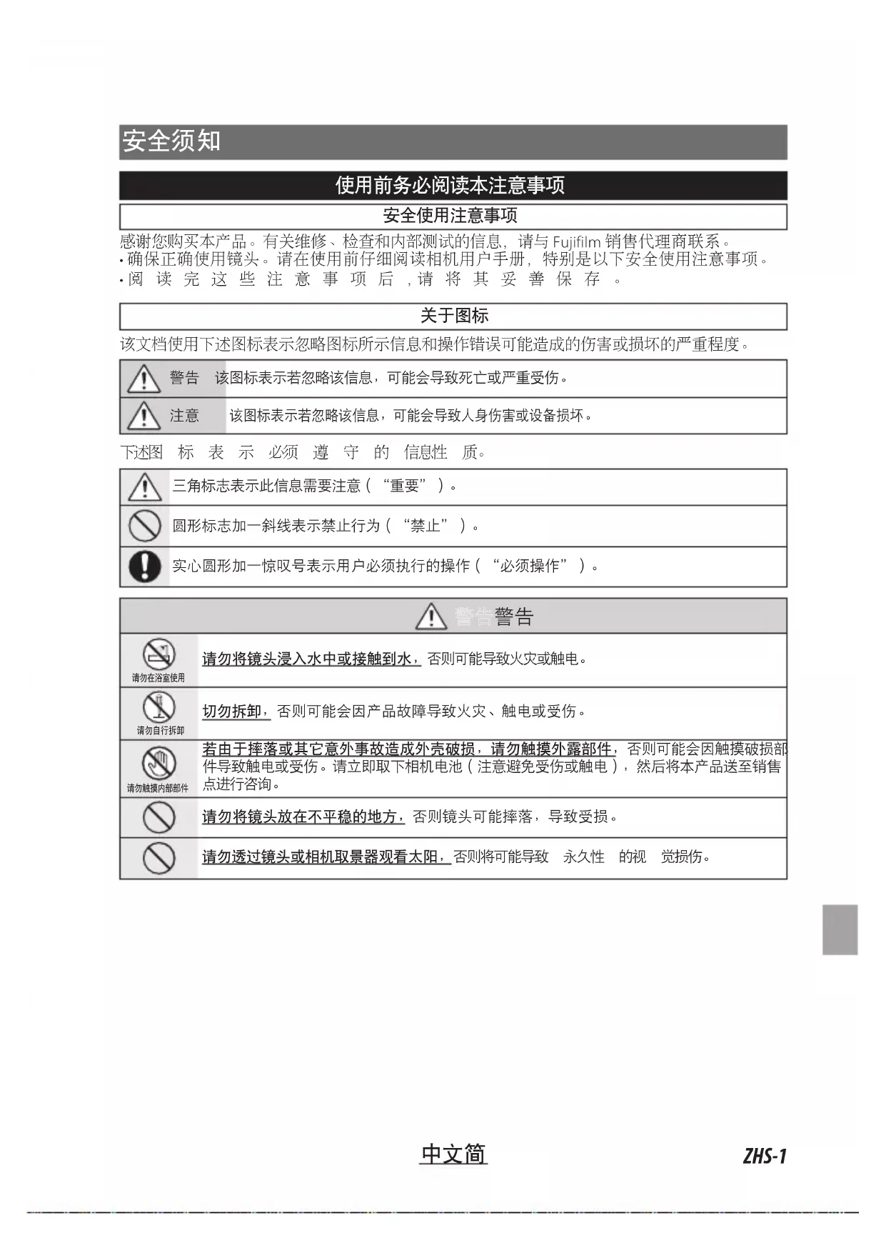 该文档使用下述图标表示忽略图标所示信息和操作错误可能造成的伤害或损坏的严重程度。 警告 该图标表示若忽略该信息,可能会导致死亡或严重受伤。 该图标表示若忽略该信息,可能会导致人身伤害或设备损坏。 下述图 标 表 示 必须 遵 守 的 信息性 质。 三角标志表示此信息需要注意(“重要”)。圆形标志加一斜线表示禁止行为(“禁止”)。实心圆形加一惊叹号表示用户必须执行的操作(“必须操作”)。 请勿在浴室使用请勿将镜头浸入水中或接触到水,否则可能导致火灾或触电。请勿自行拆卸切勿拆卸,否则可能会因产品故障导致火灾、触电或受伤。请勿触摸内部部件若由于摔落或其它意外事故造成外壳破损,请勿触摸外露部件,否则可能会因触摸破损部件导致触电或受伤。请立即取下相机电池(注意避免受伤或触电),然后将本产品送至销售点进行咨询。请勿将镜头放在不平稳的地方,否则镜头可能摔落,导致受损。请勿透过镜头或相机取景器观看太阳,否则将可能导致 永久性 的视 觉损伤。ZHS-2