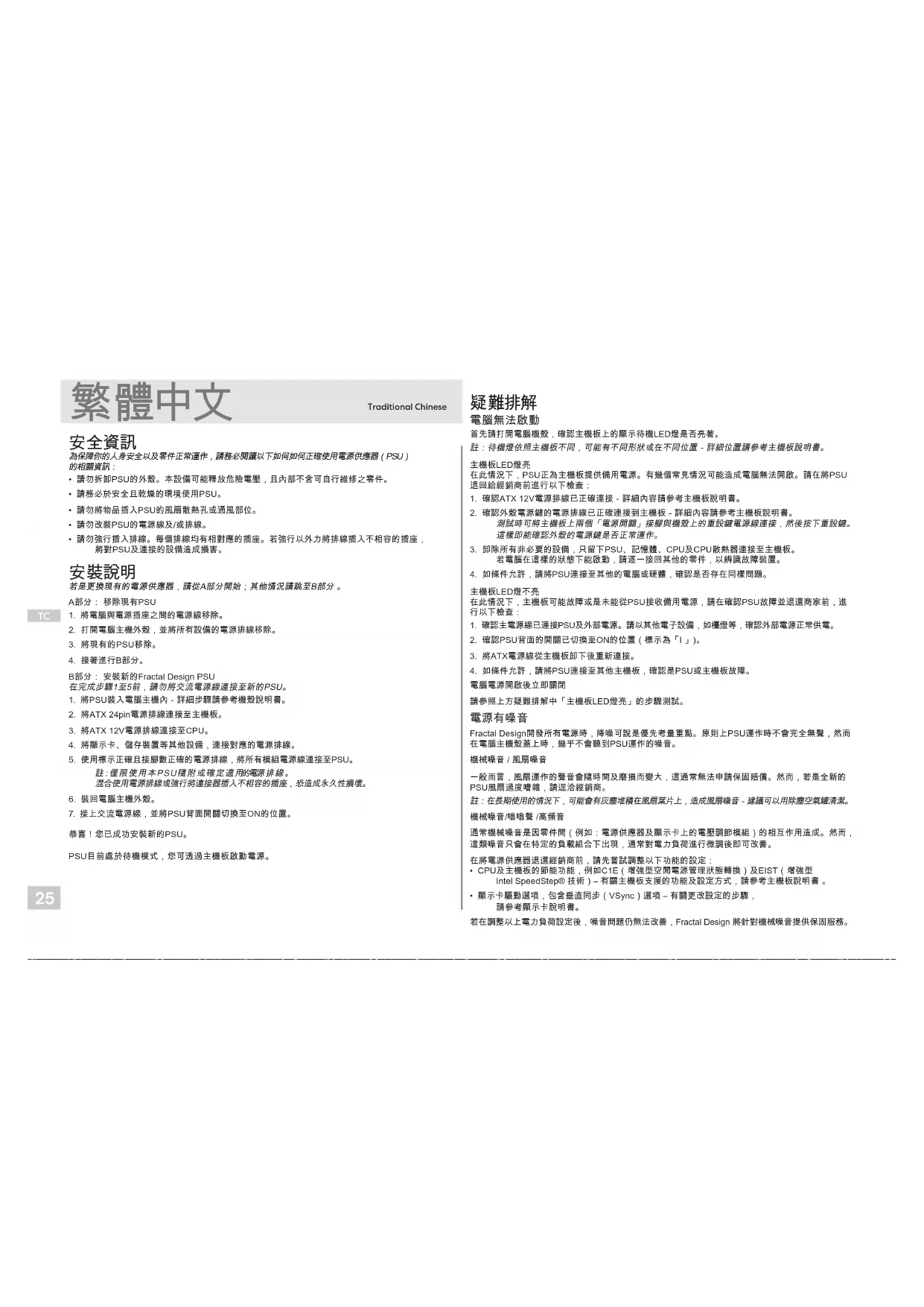首先請打開電腦機殼,確認主機板上的顯示待機LED燈是否亮著。 註:待機燈依照主機板不同,可能有不同形狀或在不同位置-詳細位置請參考主機板說明書。 主機板LED燈亮 在此情況下,PSU正為主機板提供備用電源。有幾個常見情況可能造成電腦無法開啟。請在將PSU退回給經銷商前進行以下檢查: 1. 確認ATX 12V電源排線已正確連接-詳細內容請參考主機板說明書。 2. 確認外殼電源鍵的電源排線已正確連接到主機板-詳細內容請參考主機板說明書。 測試時可將主機板上兩個「電源開關」接腳與機殼上的重設鍵電源線連接,然後按下重設鍵。這樣即能確認外殼的電源鍵是否正常運作。 3. 卸除所有非必要的設備,只留下PSU、記憶體、CPU及CPU散熱器連接至主機板。 若電腦在這樣的狀態下能啟動,請逐一接回其他的零件,以辨識故障裝置。 4. 如條件允許,請將PSU連接至其他的電腦或硬體,確認是否存在同樣問題。 主機板LED燈不亮 在此情況下,主機板可能故障或是未能從PSU接收備用電源,請在確認PSU故障並退還商家前,進行以下檢查: 1. 確認主電源線已連接PSU及外部電源。請以其他電子設備,如檯燈等,確認外部電源正常供電。 2. 確認PSU背面的開關已切換至ON的位置(標示為「I 」)。 3. 將ATX電源線從主機板卸下後重新連接。 4. 如條件允許,請將PSU連接至其他主機板,確認是PSU或主機板故障。 電腦電源開啟後立即關閉 請參照上方疑難排解中「主機板LED燈亮」的步驟測試。 Fractal Design開發所有電源時,降噪可說是優先考量重點。原則上PSU運作時不會完全無聲,然而在電腦主機殼蓋上時,幾乎不會聽到PSU運作的噪音。 機械噪音 / 風扇噪音 一般而言,風扇運作的聲音會隨時間及磨損而變大,這通常無法申請保固賠償。然而,若是全新的PSU風扇過度嘈雜,請逕洽經銷商。 註:在長期使用的情況下,可能會有灰塵堆積在風扇葉片上,造成風扇噪音-建議可以用除塵空氣罐清潔。 機械噪音/嗡嗡聲 /高頻音 通常機械噪音是因零件間(例如:電源供應器及顯示卡上的電壓調節模組)的相互作用造成。然而,這類噪音只會在特定的負載組合下出現,通常對電力負荷進行微調後即可改善。 在將電源供應器退還經銷商前,請先嘗試調整以下功能的設定: • CPU及主機板的節能功能,例如C1E(增強型空閒電源管理狀態轉換)及EIST(增強型 Intel SpeedStep® 技術)– 有關主機板支援的功能及設定方式,請參考主機板說明書 。 • 顯示卡驅動選項,包含垂直同步(VSync)選項 – 有關更改設定的步驟, 請參考顯示卡說明書。 若在調整以上電力負荷設定後,噪音問題仍無法改善,Fractal Design 將針對機械噪音提供保固服務。26