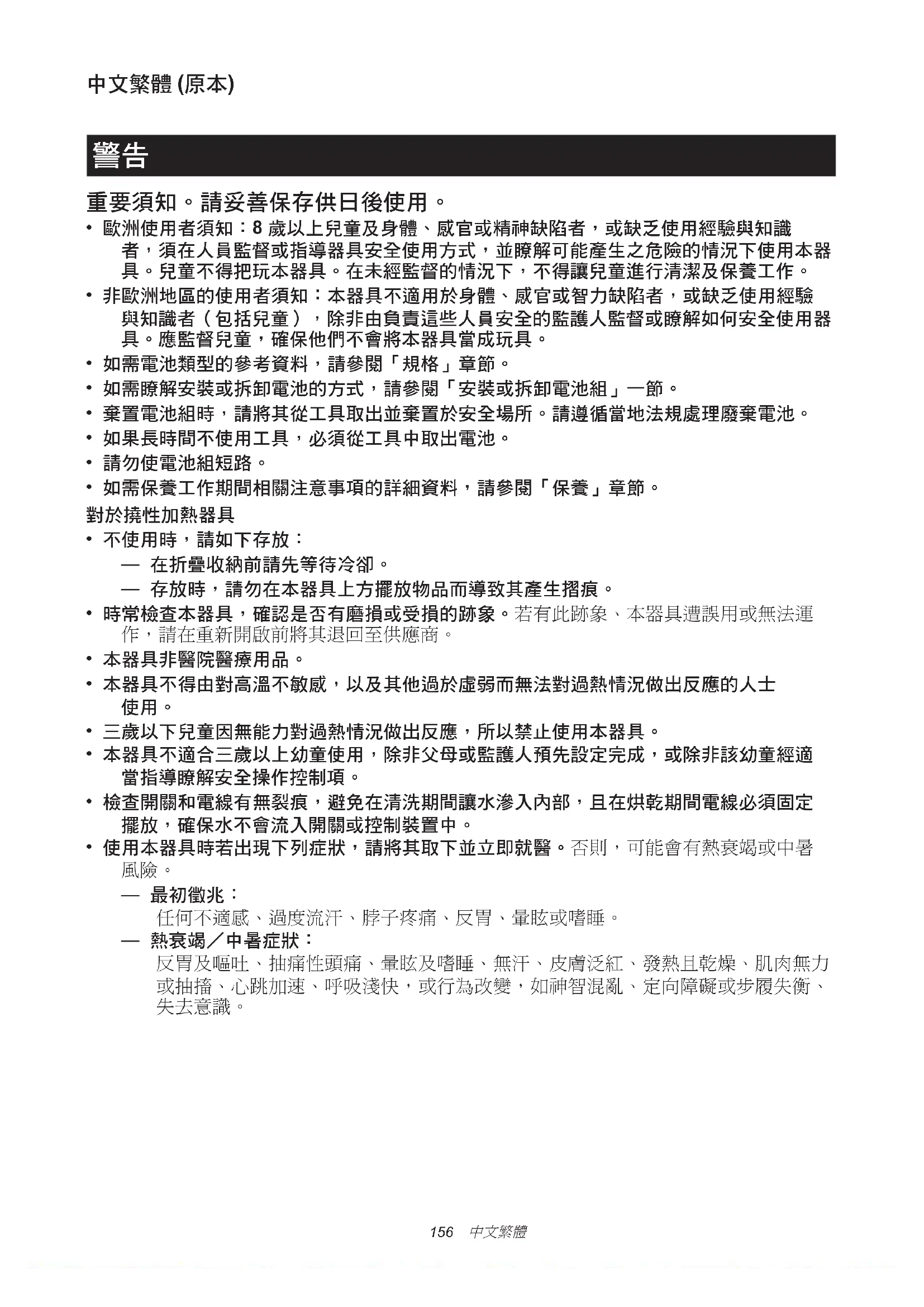 - 本器具不得由對高溫不敏感,以及其他過於虛弱而無法對過熱情況做出反應的人士