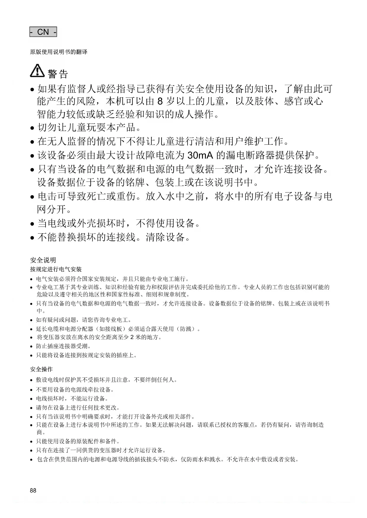 - 该设备必须由最大设计故障电流为 30mA 的漏电断路器提供保护。