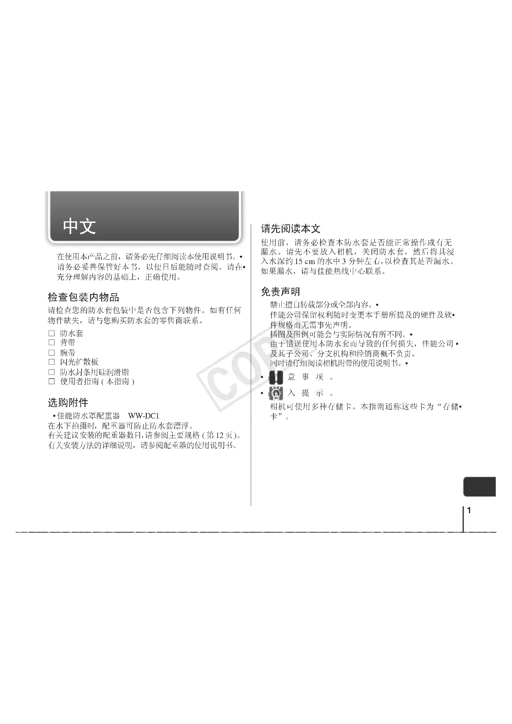 禁止擅自转载部分或全部内容。• 佳能公司保留权利随时变更本手册所提及的硬件及软• 件规格而无需事先声明。 插图及图例可能会与实际情况有所不同。• 由于错误使用本防水套而导致的任何损失,佳能公司 • 及其子公司、分支机构和经销商概不负责。 同时请仔细阅读相机附带的使用说明书。•