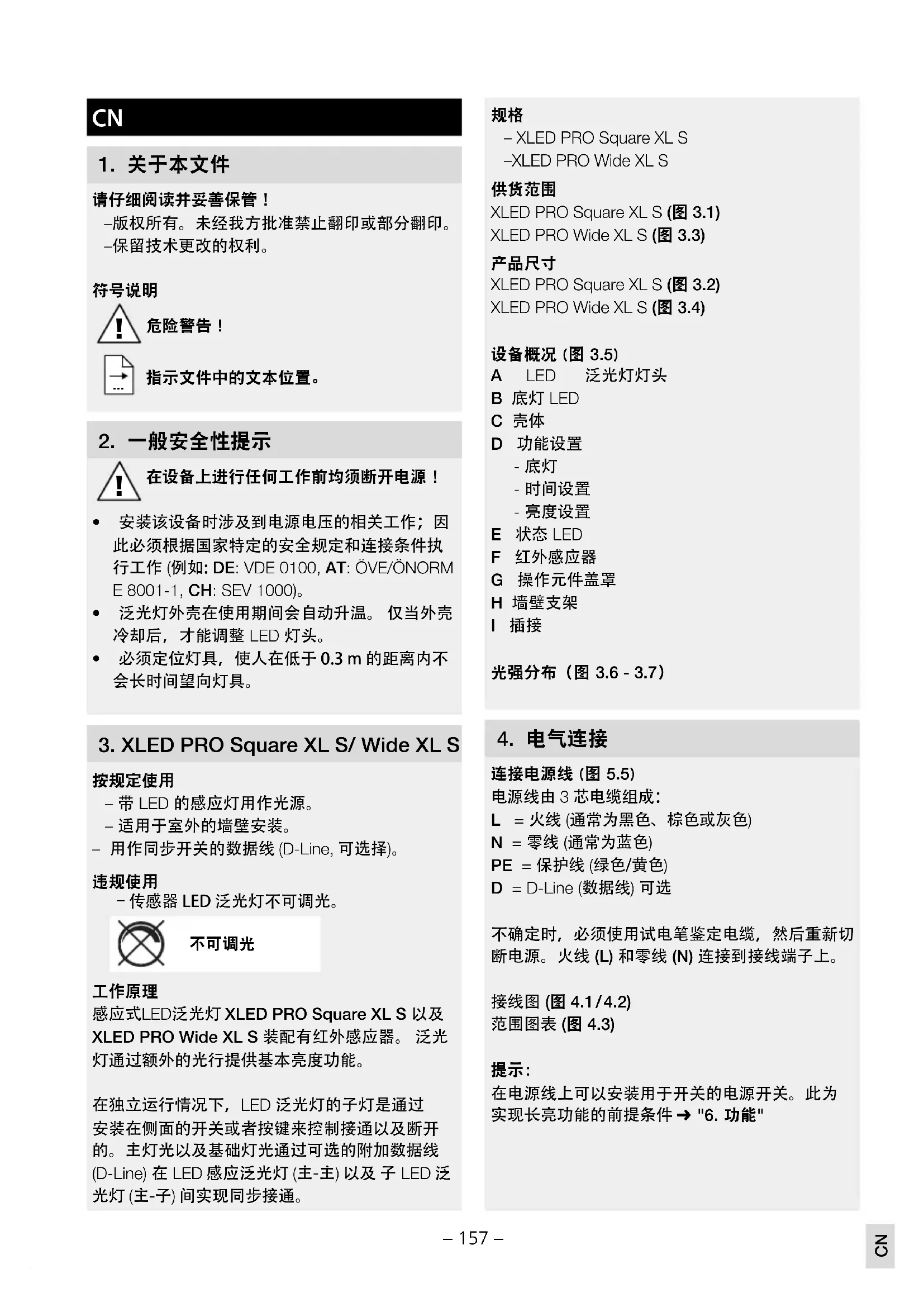 90°90°180°0° 30°30°150°150°60°120°60°120°cd / 1000 lm C0 / C180 C90 / C270 XLED PRO Square XLED PRO Square XL XLED PRO Wide XLED PRO Wide XL 传感器技术 PIR(被动红外线) 底灯 10min、30min(通过RC9)、整夜 感应有效距离 12m(安装高度2m到最大6m) 感应角度 240° 转动范围 0-90°垂直 360°水平 时间设置 5s-15min(调节器) 5s-60min(智能遥控) 10s-15min(RC9) 亮度设置 2-1000Lux(电位计) 2-1000Lux无极设置(智能遥控) 2,10,30,50,100Lux,日间模式(RC9) 程序设置 OFF(关闭)=无基础灯光,10分钟,整夜(电位计) 关闭,10分钟–30分钟,整夜(智能遥控) 长亮灯 4h可调节(按键,RC9,智能遥控) 保护形式 IP54 防护等级 I 冲击强度 IK03 环境温度 -20℃至+40℃– 161 –