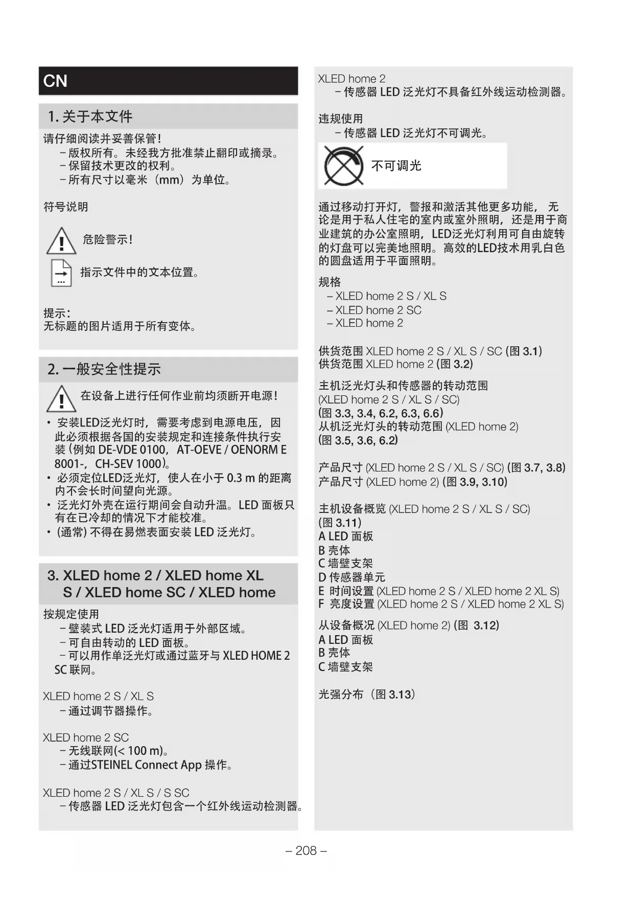 进行清洁。重要信息:操作设备无法更换。 8.废弃物处理 电子设备,附件和包装应根据环保要求寻求再次 不得将电子设备投入生活垃圾!仅针对欧盟国家:根据适用的关于废旧电子设备和电子元件欧盟指令及其在国家法律中的实施规则,必须将无法再使用的电子设备分开收集在一起并根据环保要求寻求再次利用。 9.一致性声明 STEINELGmbH特此声明,XLED home 2 SC的无线电设备类型符合指令2014/53/EU。有关欧盟一致性声明的完整文本请参阅以下网址:www.steinel.de 10.制造商担保 作为购买方相对销售商具有法定的免费修换权和保修权.如果您所在国家具有相关法律规定,该权利不受我们质保声明而缩短或任何限制。我们为施特朗专业传感器产品的完好性能和正常功能提供5年质保。我们保证此产品不含材料、生产和结构方面的缺陷.我们保证所有电子部件和电缆的功能可靠性以及所使用的材料及其表面无任何缺陷。质保索赔:如需提出产品索赔,则请您将完整的原始购买凭证(必须包含购买日期和产品名称的说明)自费邮寄给您的经销商或直接邮寄给我们:Rm.25AHuaduMansion,No.828-838ZhangyangRoad,200122Shang-hai,PRChina。为此,建议您妥善保存购买凭证,直至质保期到期。施特朗对寄回过程中的运输费用和风险不承担任何责任。质保索赔的相关信息请参见我们网站的主页www.steinel.cn如果您对质保或产品有任何疑问,敬请垂询:服务热线+862158204486。