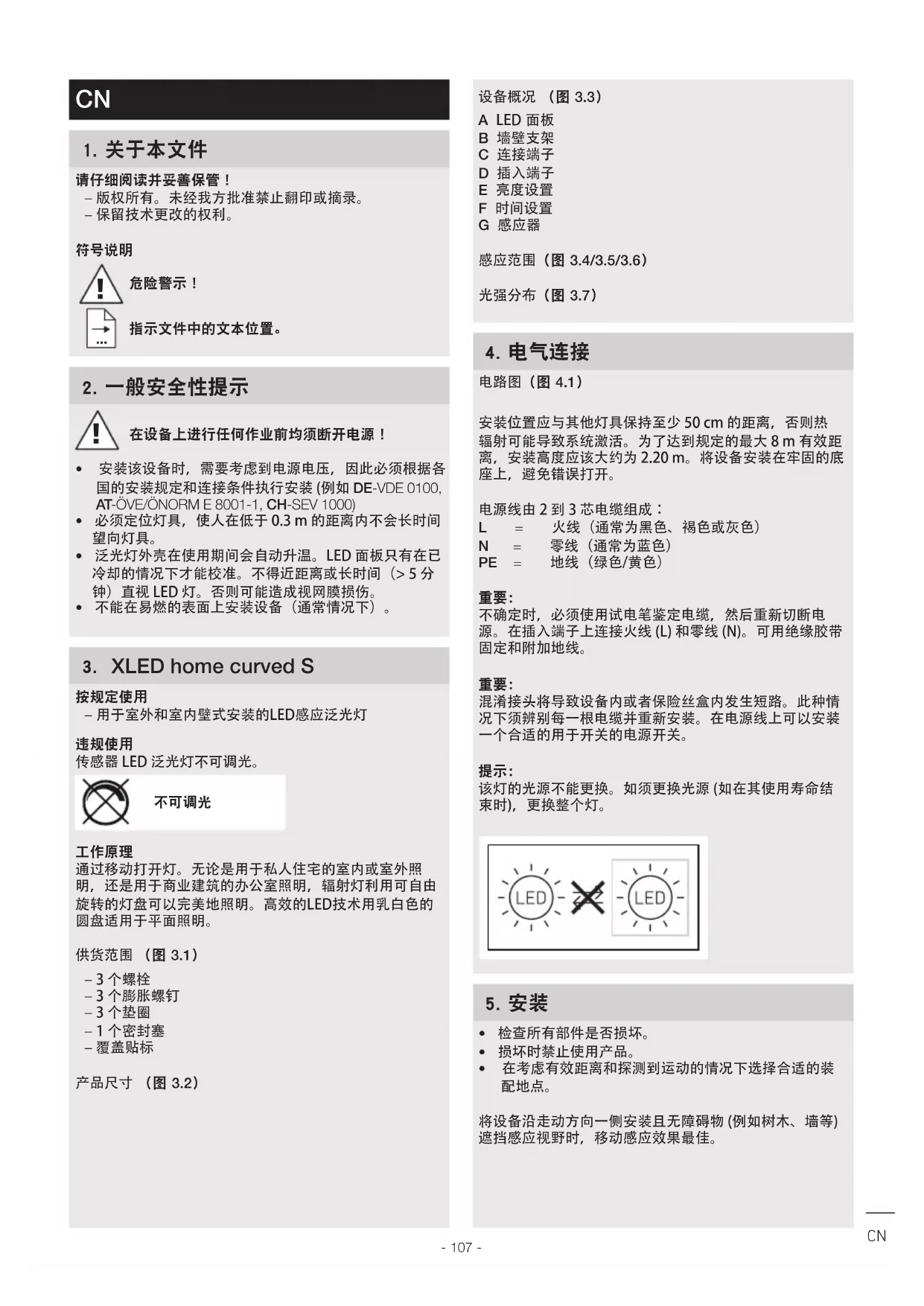 在设备上进行任何作业前均须断开电源! • 安装该设备时,需要考虑到电源电压,因此必须根据各国的安装规定和连接条件执行安装 (例如 DE-VDE 0100, AT-ÖVE/ÖNORM E 8001-1, CH-SEV 1000)• 必须定位灯具,使人在低于 0.3 m 的距离内不会长时间望向灯具。• 泛光灯外壳在使用期间会自动升温。LED 面板只有在已冷却的情况下才能校准。不得近距离或长时间(> 5 分钟)直视 LED 灯。否则可能造成视网膜损伤。• 不能在易燃的表面上安装设备(通常情况下)。