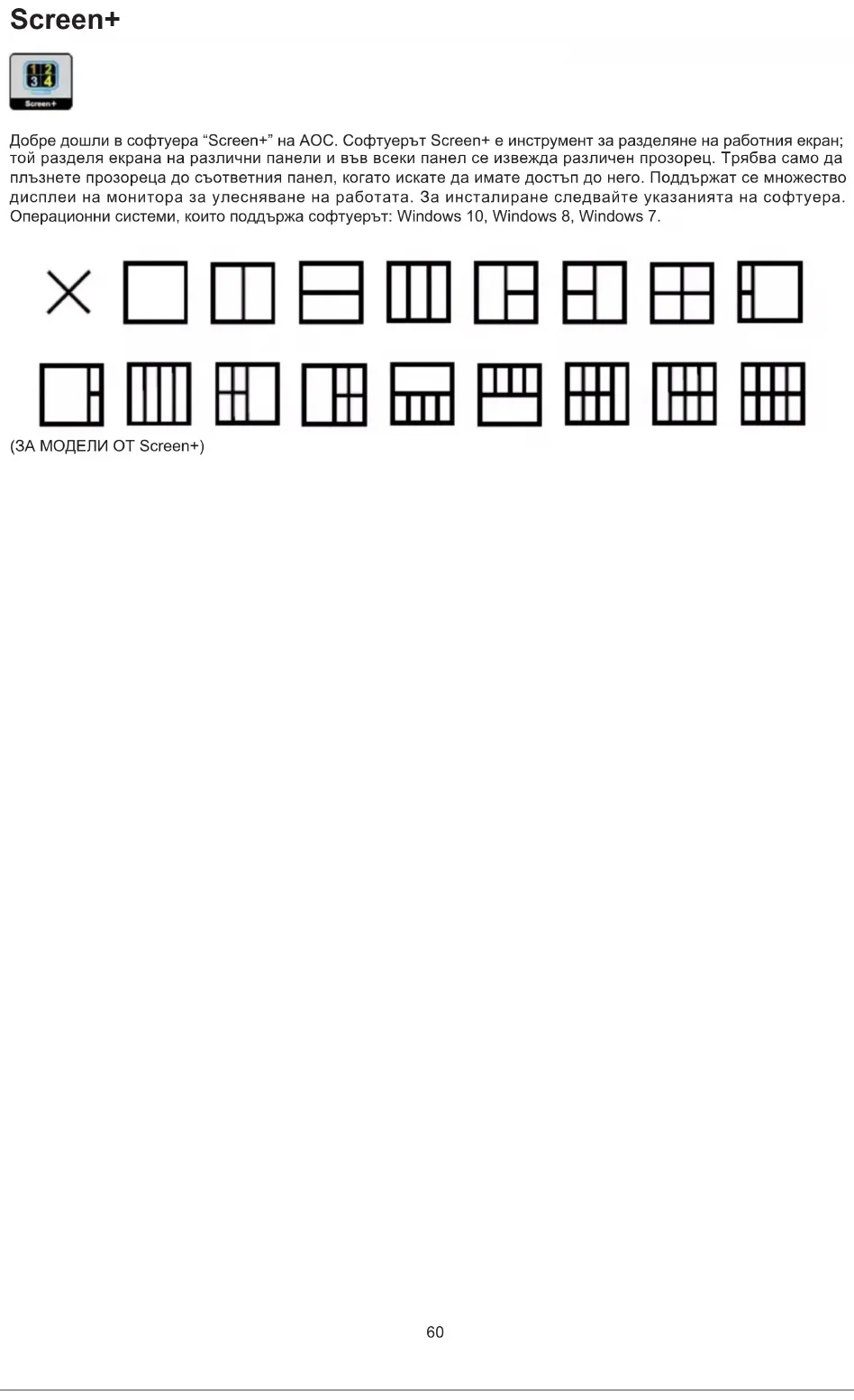 e-Saver 機型)100 Screen+ 歡迎使用 AOC 的「Screen+」軟體。Screen+ 軟體是一套桌面畫面分割工具,可將桌面分割為多個面板,各面板顯示不同的 視窗。 需使用時,只要將視窗拖曳至對應面板即可。多顯示器顯示的支援功能,可讓您的工作更輕鬆。請按安裝步驟進行 安裝。本軟體支援作業系統: Windows 10、Windows 8、Windows 7。