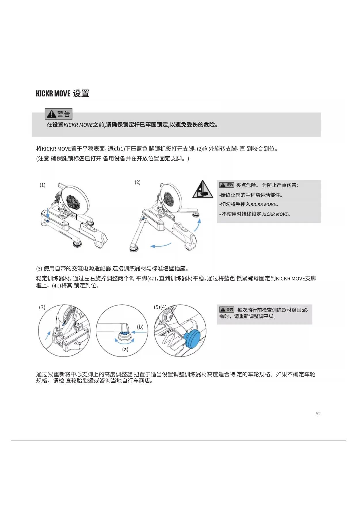 (8) Adapter C – 针对12x142和12x148 贯通轴 (9) Adapter D - 12x142 Thru Axle (10) Adapter E - 12x148 Thru Axle (11a) Axis Feet - Small (11b) Axis Feet - Medium *Pre-installed (11c) Axis Feet - Large SIMPLIFIED CHINESE (11a) (11c)52 (2) 将KICKR MOVE置于平稳表面,通过(1)下压蓝色腿锁标签打开支脚,(2)向外旋转支脚,直到咬合到位。 (注意:确保腿锁标签已打开备用设备并在开放位置固定支脚。) KICKR MOVE 设置 (3) 使用自带的交流电源适配器连接训练器材与标准墙壁插座。 稳定训练器材,通过左右旋拧调整两个调平脚(4a),直到训练器材平稳,通过将蓝色锁紧螺母固定到KICKR MOVE支脚 框上,(4b)将其锁定到位。 通过(5)重新将中心支脚上的高度调整旋扭置于适当设置调整训练器材高度适合特定的车轮规格。如果不确定车轮 规格,请检查轮胎胎壁或咨询当地自行车商店。 (1) (5)(4) (a) (b) (3) 每次骑行前检查训练器材稳固;必 需时,请重新调整调平脚。 夹点危险。 为防止严重伤害: