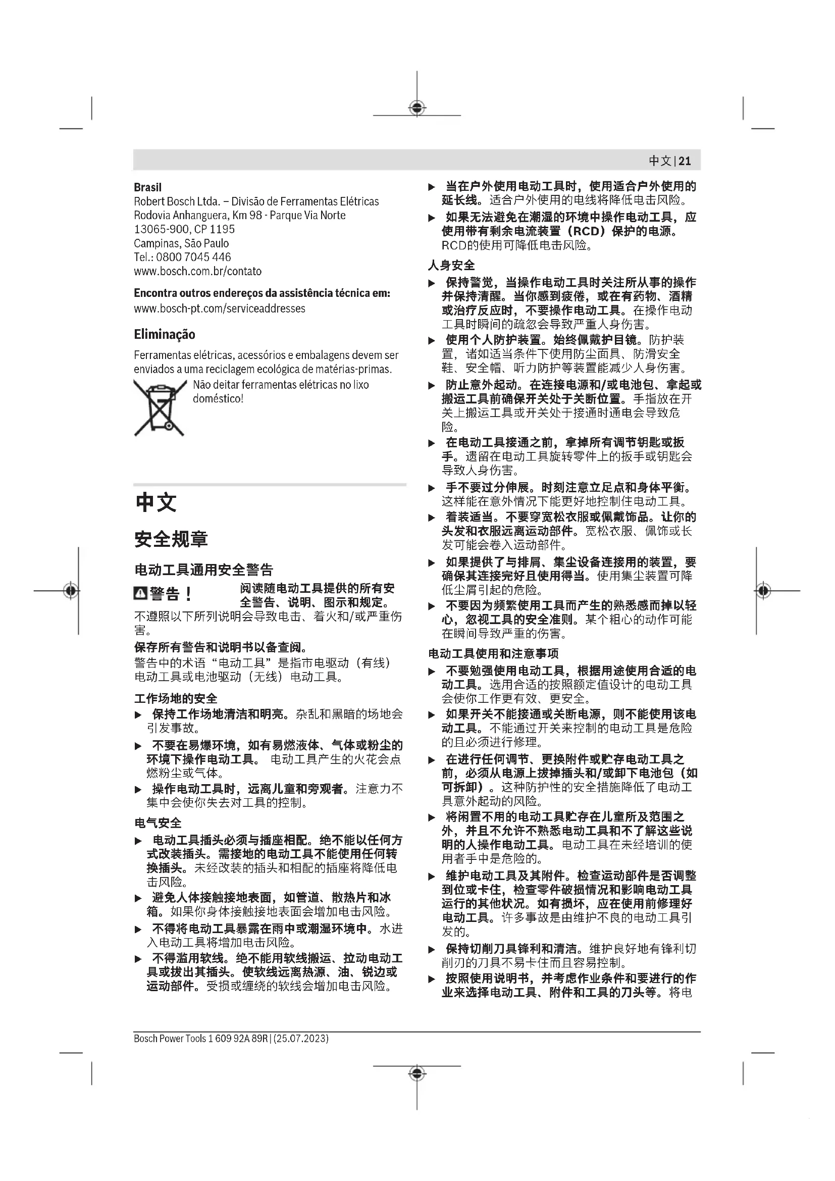 /II 所有参数适用于230伏的额定电压[U],对于其他不同的电压 和国际规格,数据有可能不同。 1 609 92A 89R | (25.07.2023) Bosch Power Tools中文 | 23