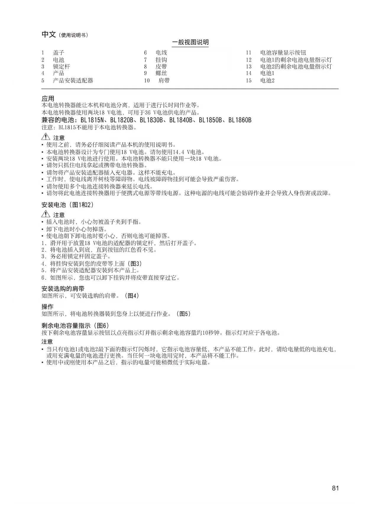 本电池转换器能让本机和电池分离,适用于进行长时间作业等。 本电池转换器使用两块18V电池,可用于36V电池供电的产品。 兼容的电池:BL1815N、BL1820B、BL1830B、BL1840B、BL1850B、BL1860B 注意:BL1815不能用于本电池转换器。