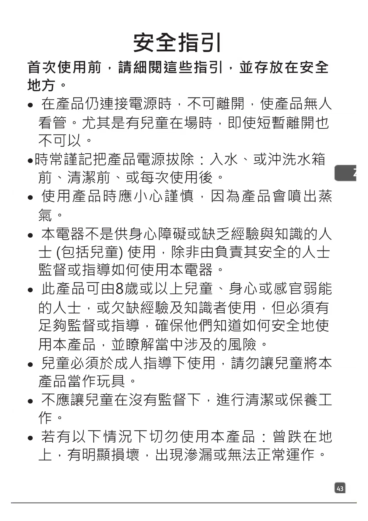 - 此產品可由8歲或以上兒童、身心或感官弱能 的人士,或欠缺經驗及知識者使用,但必須有 足夠監督或指導,確保他們知道如何安全地使 用本產品,並瞭解當中涉及的風險。
